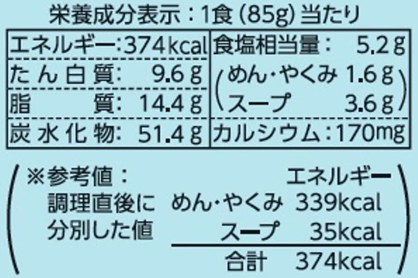 油揚げめん(小麦粉(国内製造)、植物油脂、精製ラード、食塩、植物性たん白、卵白)、添付調味料(食塩、みそ、糖類、香辛料、ポークエキス、たん白加水分解物、粉末野菜、チキンエキス、粉末油脂、植物油、ねぎ)/調味料(アミノ酸等)、炭酸カルシウム、カラメル色素、かんすい、酸化防止剤(ビタミンE)、乳化剤、香料、(一部に小麦・卵・乳成分・大豆・鶏肉・豚肉を含む)
