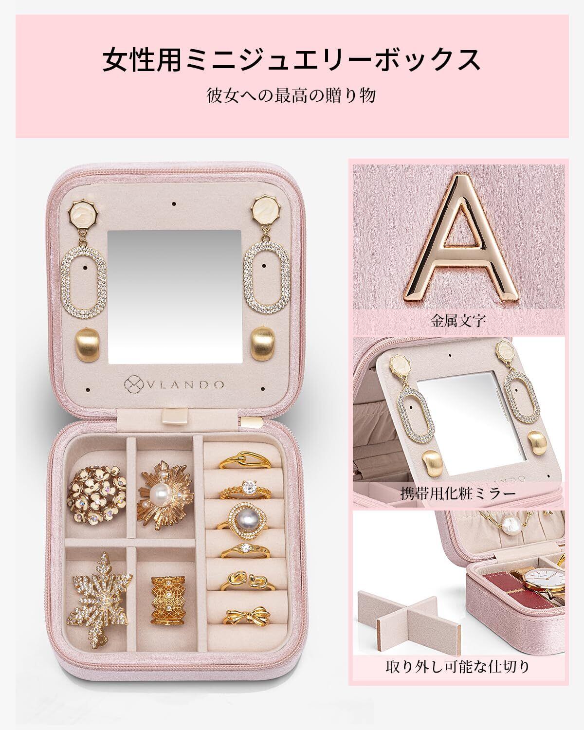 Vlando 誕生日プレゼント 女性 クリスマスプレゼント 名前入り イニシャル ギフト アクセサリーケース 携帯用 持ち運び 鏡付き ジュエリーボックス トラベル かわいい 母の日 記念日 バレンタイン 結婚式 送別 退職 祝い 贈り物(ピンクA)