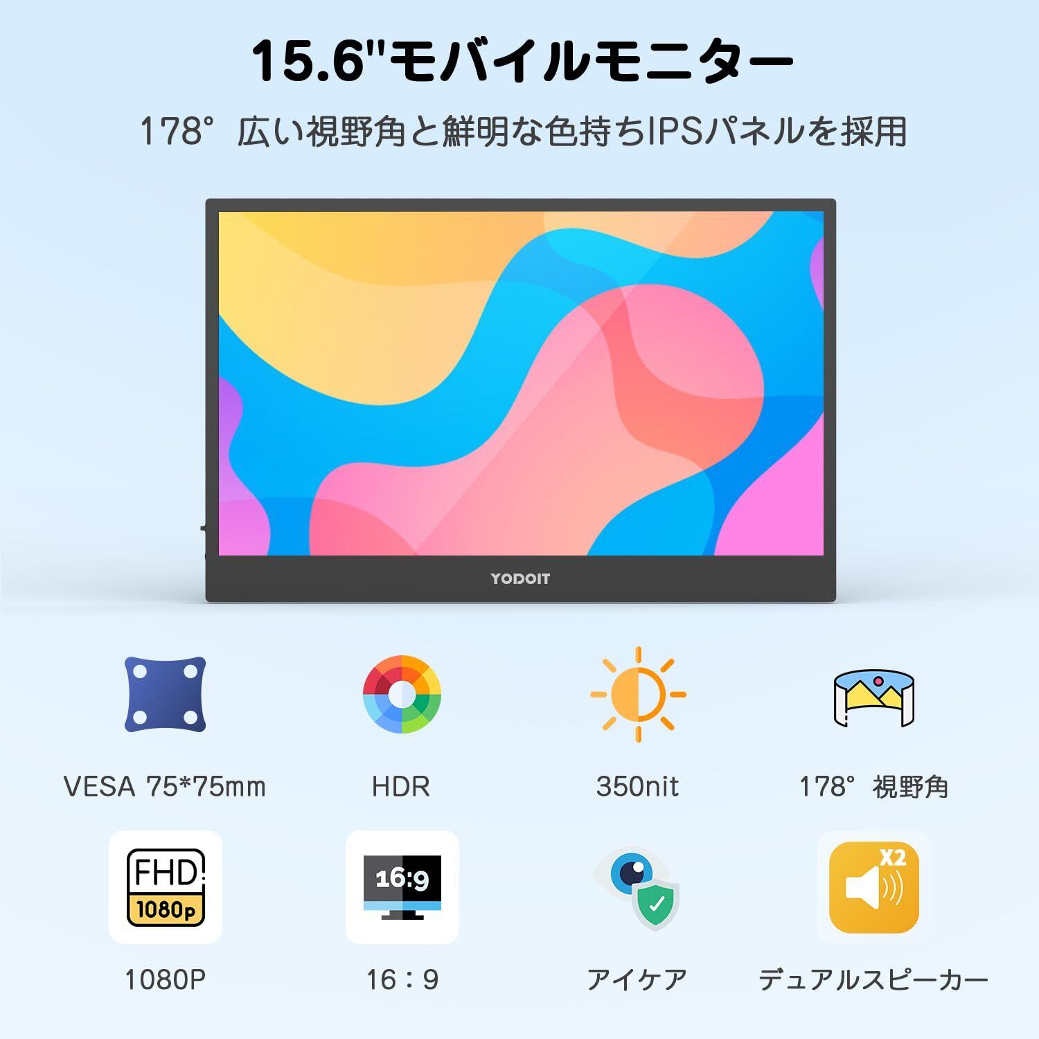 Yodoit モバイルモニター モバイルディスプレイ ポータブルモニター 軽量 アルミ製 放熱優れ 100%sRGB VESA 15.6インチ 1080P FHD Tpye-C/mini HDMI カバー付属 持ち運び便利 スピーカー内蔵 Switch/PS4/PS5/XBOX/PC/Macなど対応 (ブラック)