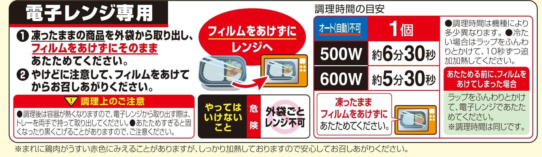米(国産)、鶏肉、タルタルソース、揚げなす、はっ酵調味料、植物油脂、いんげん、しょうゆ、砂糖、小麦粉、醸造酢、たまねぎペースト、でん粉、ゼラチン、かつおエキス、塩こうじ、加工油脂、おろししょうが、食塩、大豆粉、粉末状植物性たん白、香辛料、粉末全卵、全粉乳、卵白、えびエキス/増粘類(加工でん粉、増粘多糖類)、加工でん粉、調味料(アミノ酸等)、pH調整剤、ベーキングパウダー、炭酸水素Na、乳化剤、香辛料抽出物、着色料(カロチノイド、VB2)、(一部にえび・小麦・卵・乳成分・ごま・大豆・鶏肉・豚肉・りんご・ゼラチンを含む)