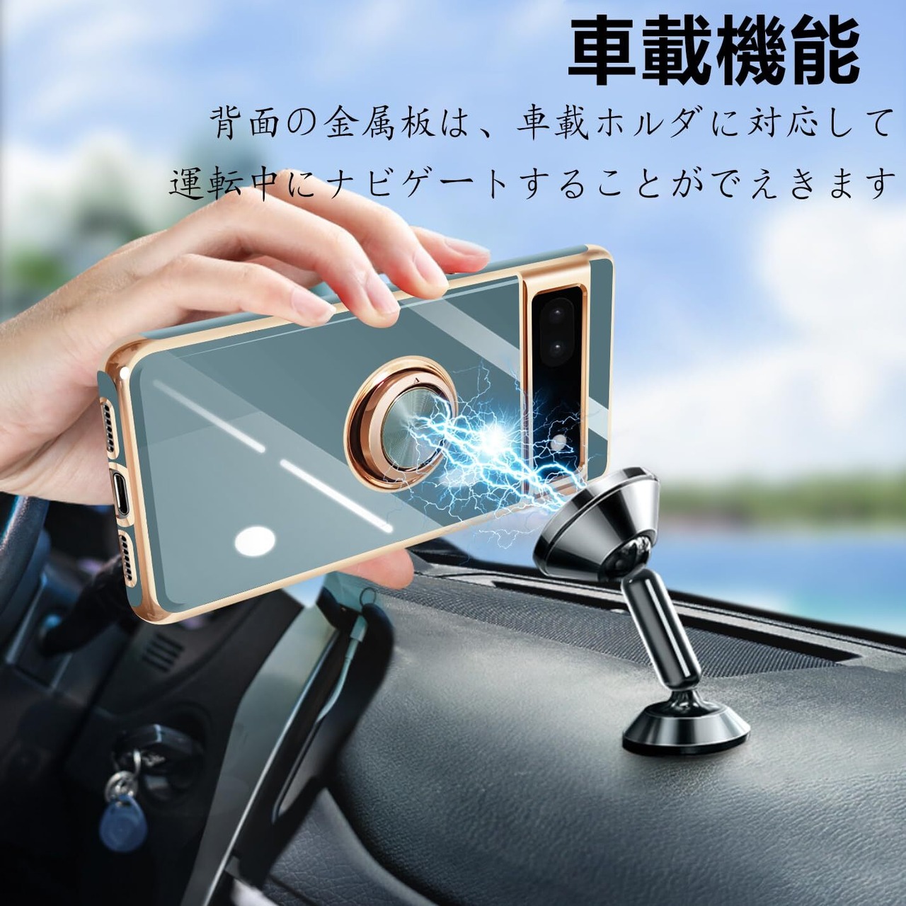【車載スタンド対応】内部には金属が内蔵され、マグネット式車載スタンドに対応。*特別ヒント:リング部分は金属ですので、ワイヤレス充電できません。