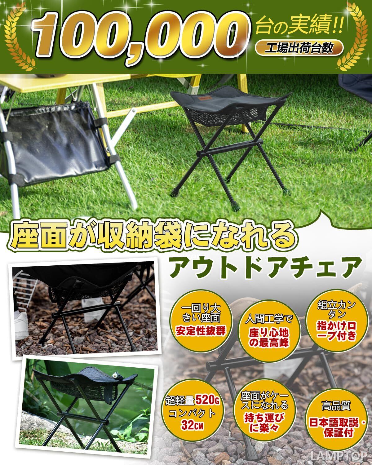 LAMPTOPアウトドアチェア コンパクト椅子 高さ34cm 超軽量520g【日本語説明書付】折りたたみ椅子 キャンプチェア お釣り お花見 待ち行列 収納袋付(ブラック)