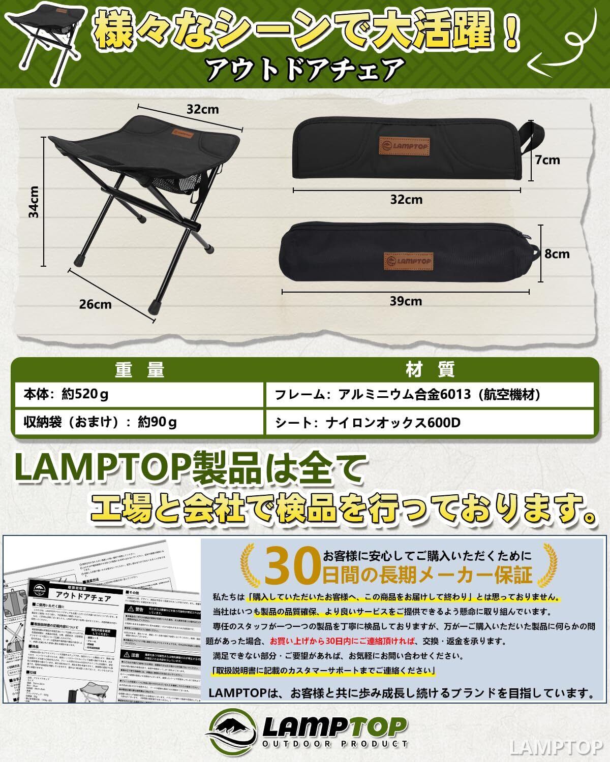 【商品仕様・日本語説明書付】材質:アルミニウム合金、オックスフォード、ナイロン 高さ:約34cm 座面サイズ:32*3cm 重量:約530g パッケージ内容:座面シート(ケースになれる)、フレーム、収納袋、説明書。 ▲アウトドアチェアは日本ブランドLAMPTOPが販売する商品(正規品)です。万が一、不良・故障などが発生しても購入日より30日間の安心付で、すぐに交換対応させていただきます。【※取説に記載されているアフターサービスの連絡先までご連絡ください。】