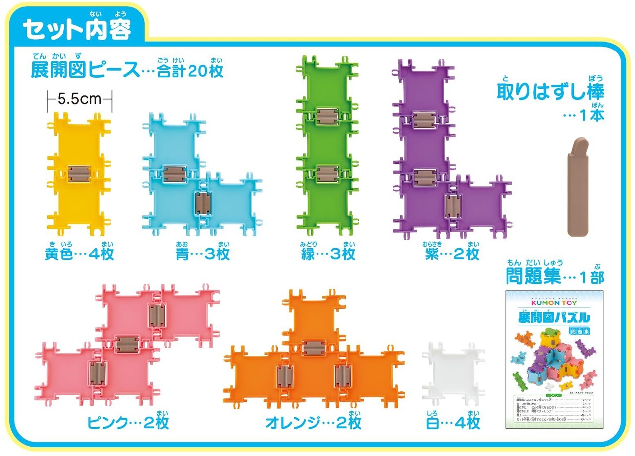 セット内容:展開図ピース:合計24枚(黄色4枚、青3枚、緑3枚、紫2枚、ピンク2枚、オレンジ2枚、白4枚)、取りはずし棒:1本、問題集:1部