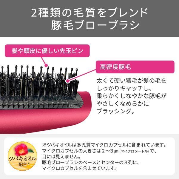 ■豚毛ブローブラシの黒色部分全面(ブラシセンター3列とブラシベース)にツバキオイルを配合したマイクロカプセルを含ませています。※ ツバキオイルは多孔質マイクロカプセルに含まれています。マイクロカプセルの大きさは2~3マイクロメートルで目には見えません。