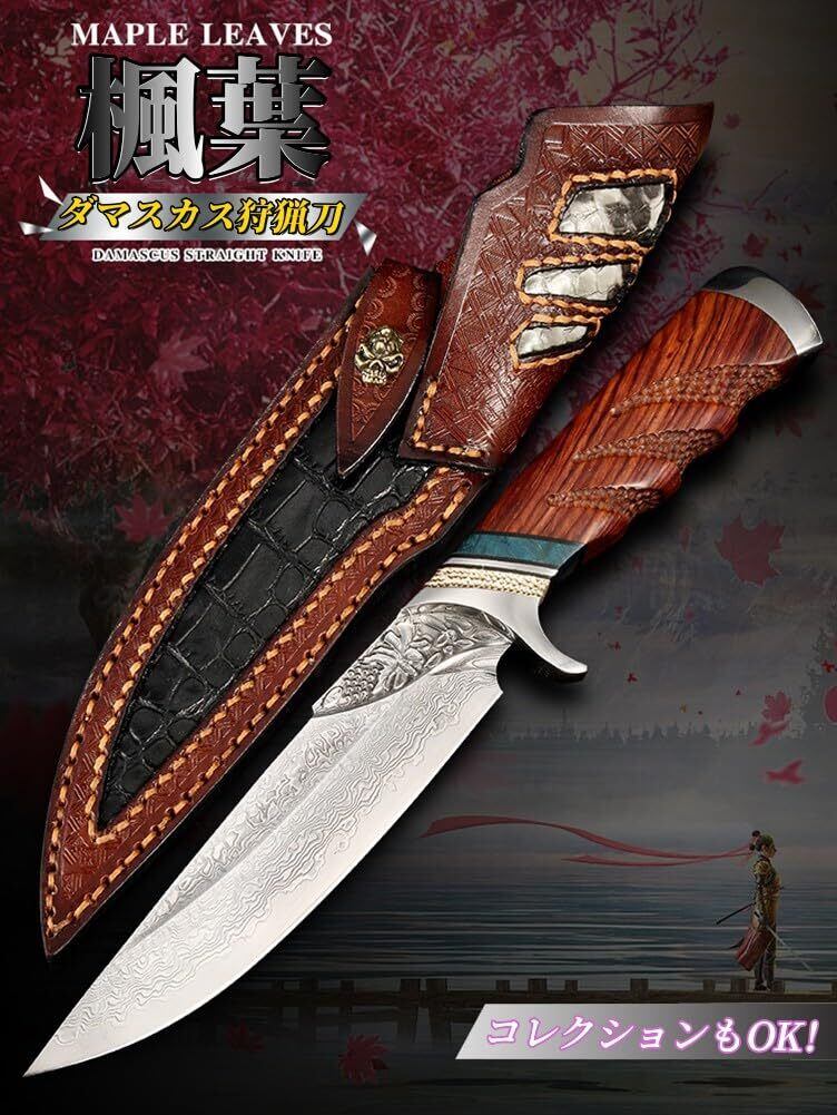 Irai Utaki アウトドアナイフ シースナイフ ナイフ ダマスカス 高級 鞘付 サバイバル 釣り 登山 キャンプ 野外作業に適用 (楓葉)