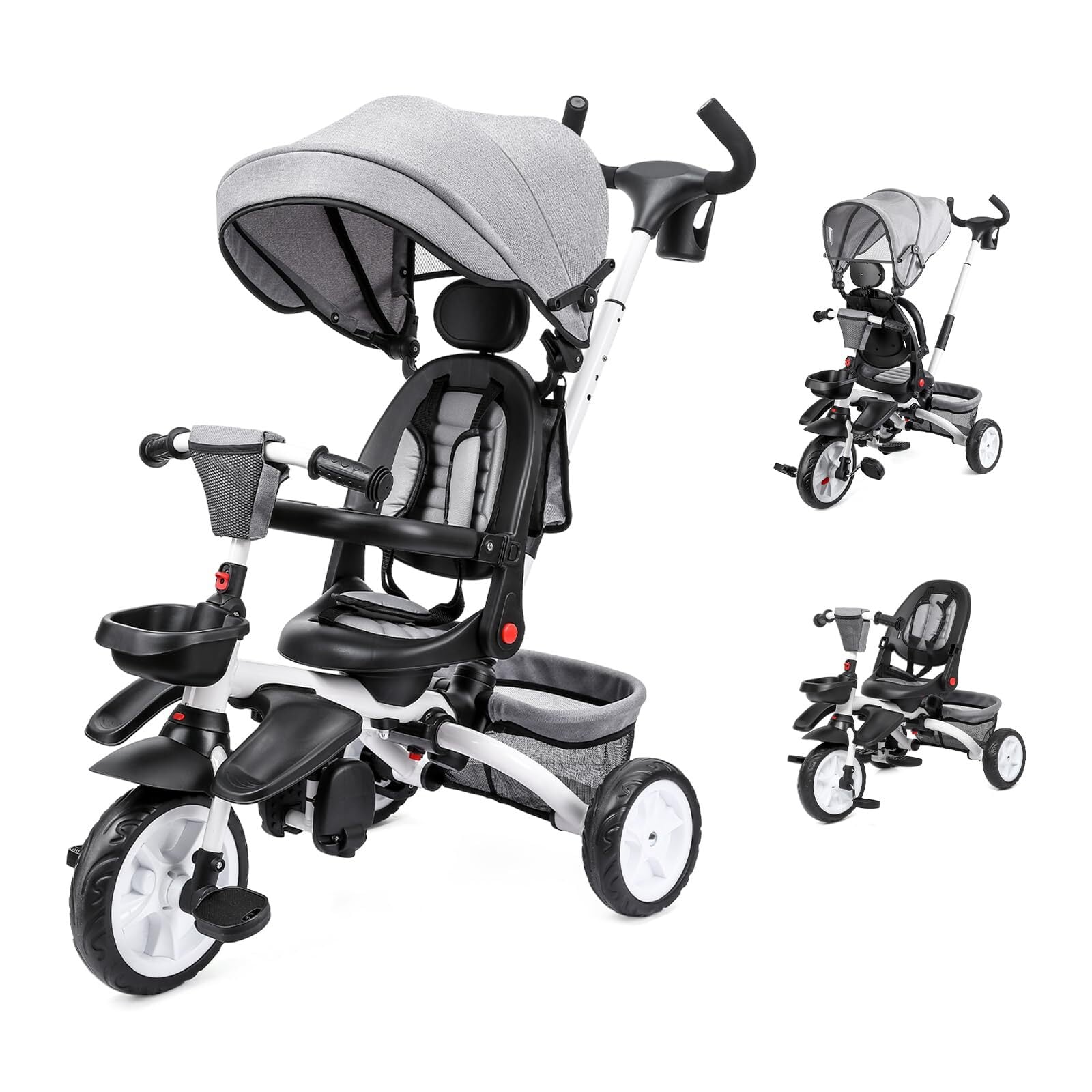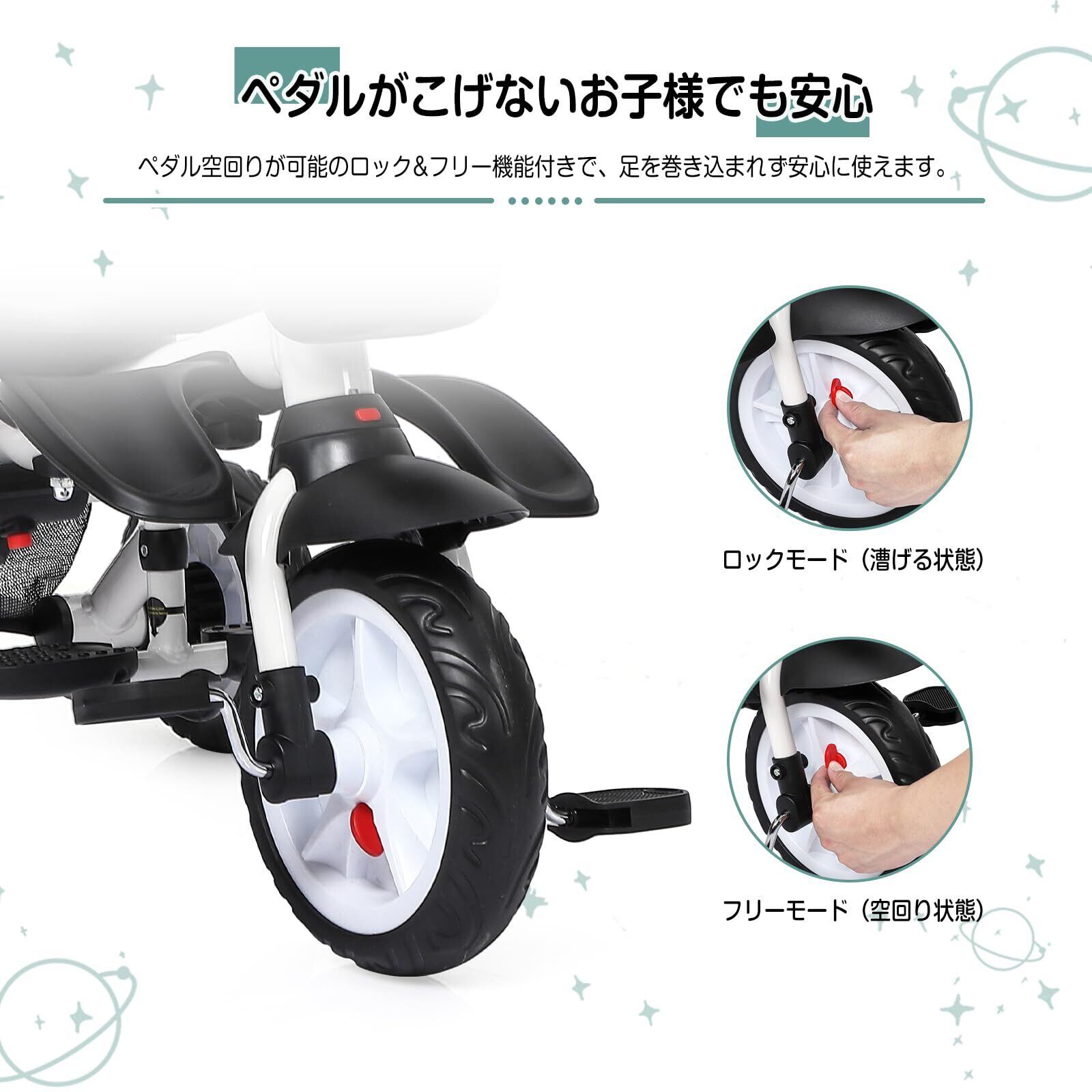 【1台5役子供用三輪車】5通りの使い方ができ、お子様の成長にあわせて長く楽しめる多機能三輪車です。ベビーカー、三輪車、様々なパターンで使える乗り物です。日光をカバーすることで暑さ対策に役立ち、ベビーカーのように使える点が魅力です。