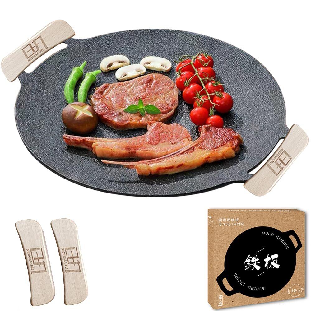 【日丸優品】マルチグリドル 鉄板 IH 直火 ガス火 直径33cm アウトドア 家庭 グリドルパン バーベキュー ソロキャンプ 軽量 シーズニング不要 お手入れ簡単 取っ手収納バッグ付属 (33cm)