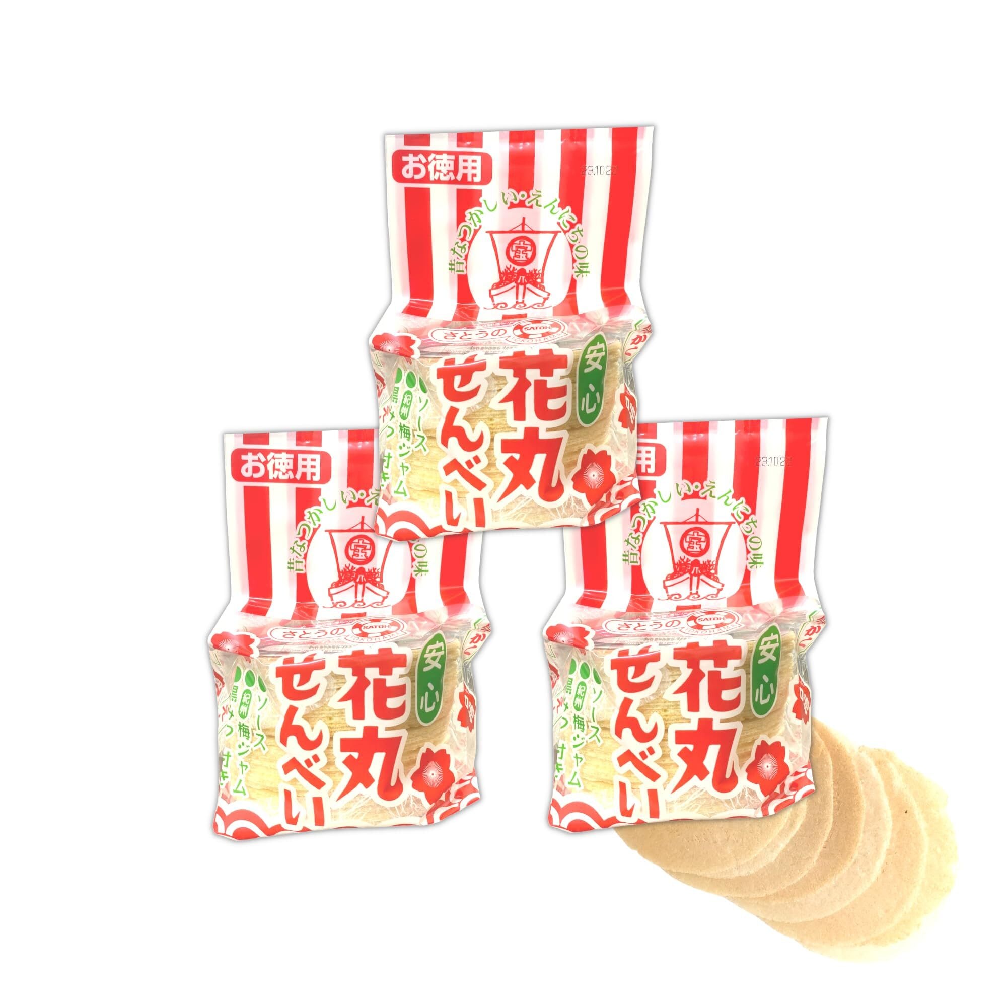佐藤製菓 お徳用 花丸せんべい 〔 紀州 梅ジャム 黒みつ 付き 〕【1袋 64g /約 45枚× 3個 セット】 〈 優しい 甘さ/昔 なつかしい 縁日 の味〉駄菓子 セット【オリジナルお手拭き (3)