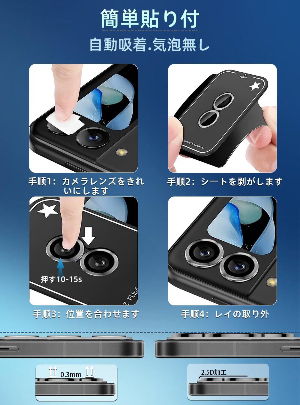 【高級感漂う単体仕上げ】Galaxy Z Flip 5カメラフィルムGalaxy Z Flip 5の独立型カメラために生まれた新作。フィルム全周はアルミ合金製リングとの融合で、本体のお洒落を向上しながら、ギャラクシーZ Flip 5本体の色味にもぴったり、抜群な一体感、上品な見栄えでカメラの魅力を格段にアップ。それに薄0.3mmのデザインと0.5gの軽さで、分厚さやケースと干渉などの悩みは全くない、いつでも楽に使える。