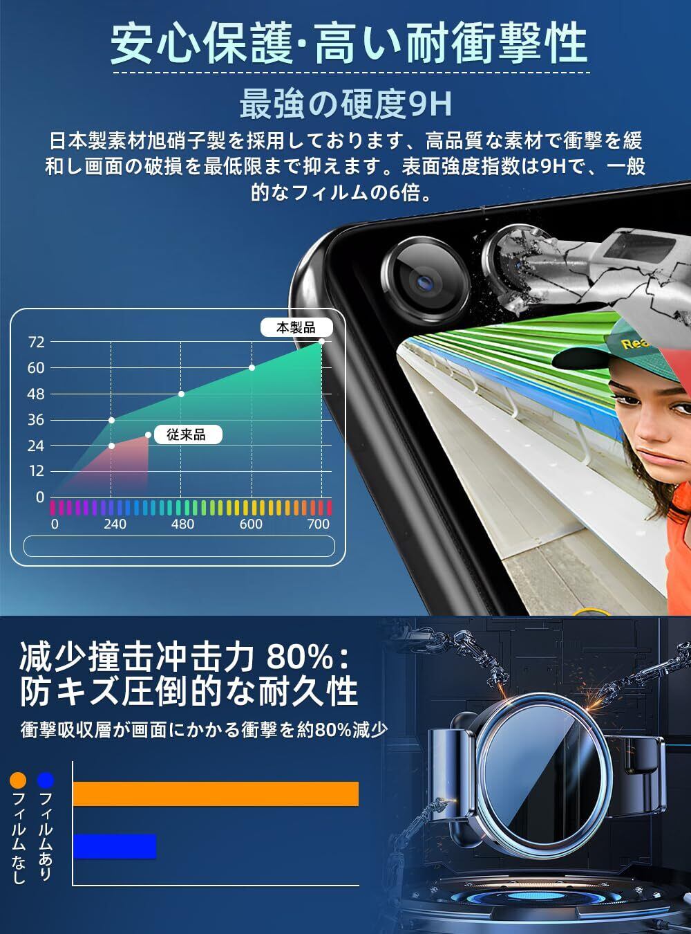 【耐衝撃性】巨大化になったカメラ、衝撃や接触からの破損のリスクも上がり、カメラ保護はもはや必須!カメラカバーはギャラクシーと同じガラス、また航空機用アルミ合金を採用、耐衝撃性が普通製品より20倍高く、盛り上がったレンズを角や落下への衝撃からしっかりと保護。更に、表面にレ一ザ焼入れ技術を採用、優れた硬化層を形成、ダイヤモンドに匹敵する硬度を実現、鍵などの鋭利な物による擦り傷から守れる。