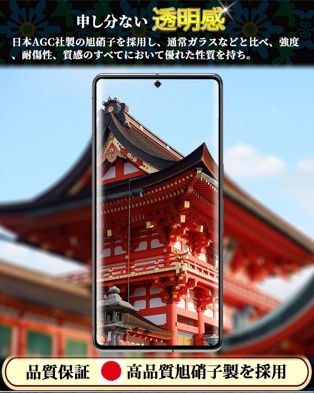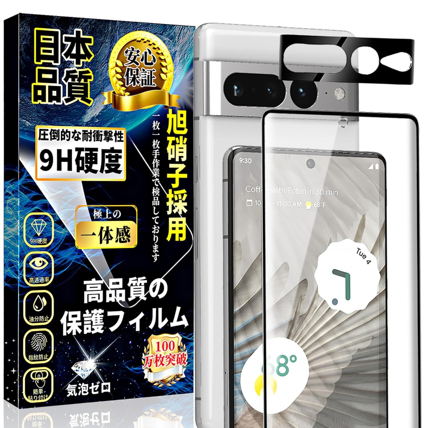 特徴 全面保護,9H表面硬度,飛散防止,防指紋,撥油コーティング,撥水剤,耐衝撃性,ラウンドエッジ,気泡なし,高透過率,簡単貼り付け