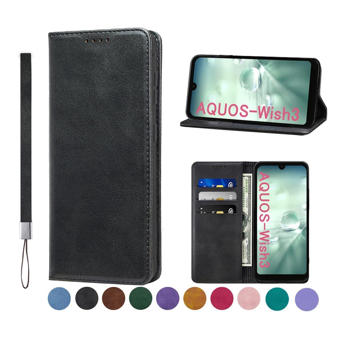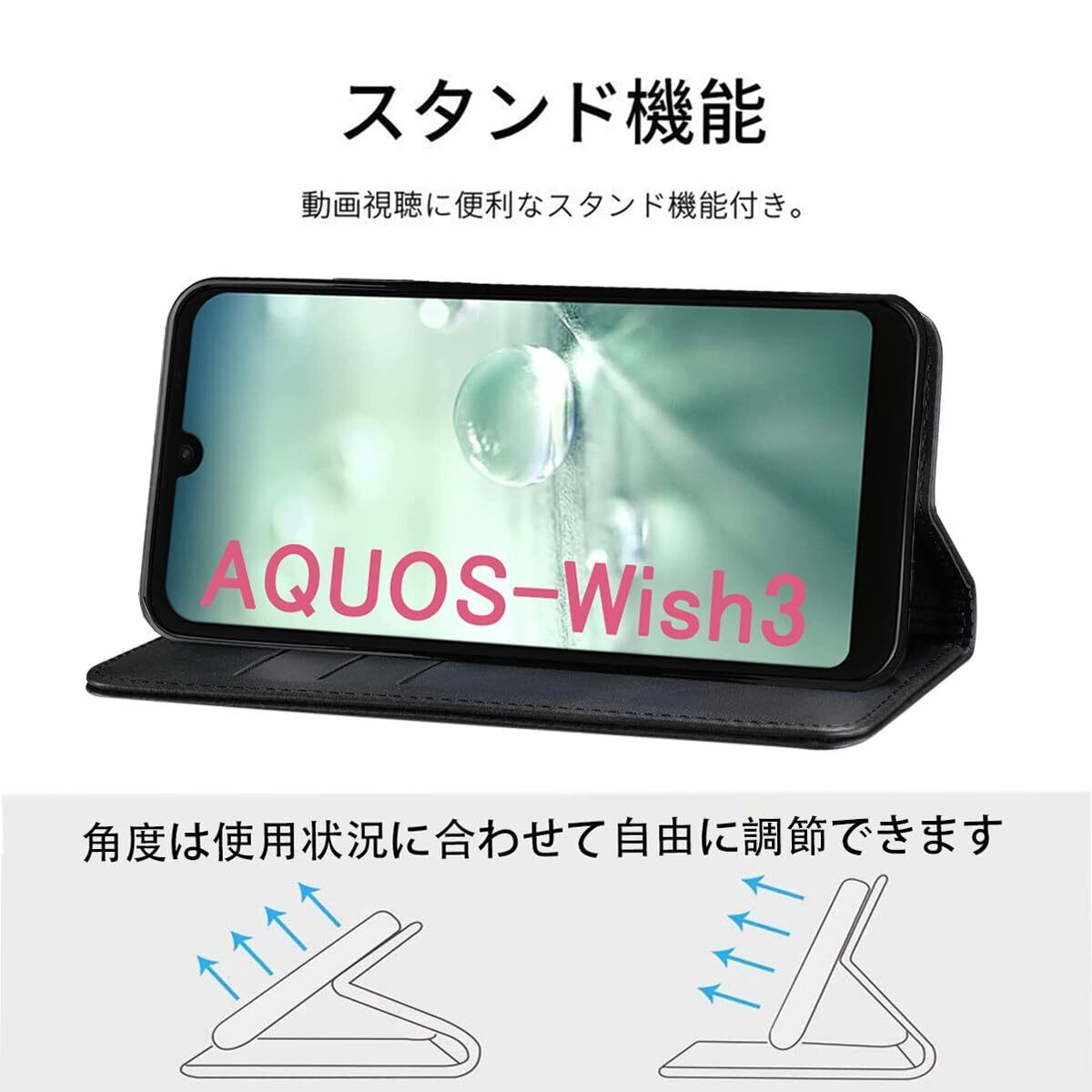 AQUOS Wish 3 ケース 手帳型 高質PUレザー AQUOS Wish 3 カバー 耐衝撃 SH-53D ケース A302SH ケース 内蔵マグネット開閉式 ベルトなし スマホケース おしゃれ カードポケット スタンド機能 便利 スプラット同梱 携帯ケース(ブラック)
