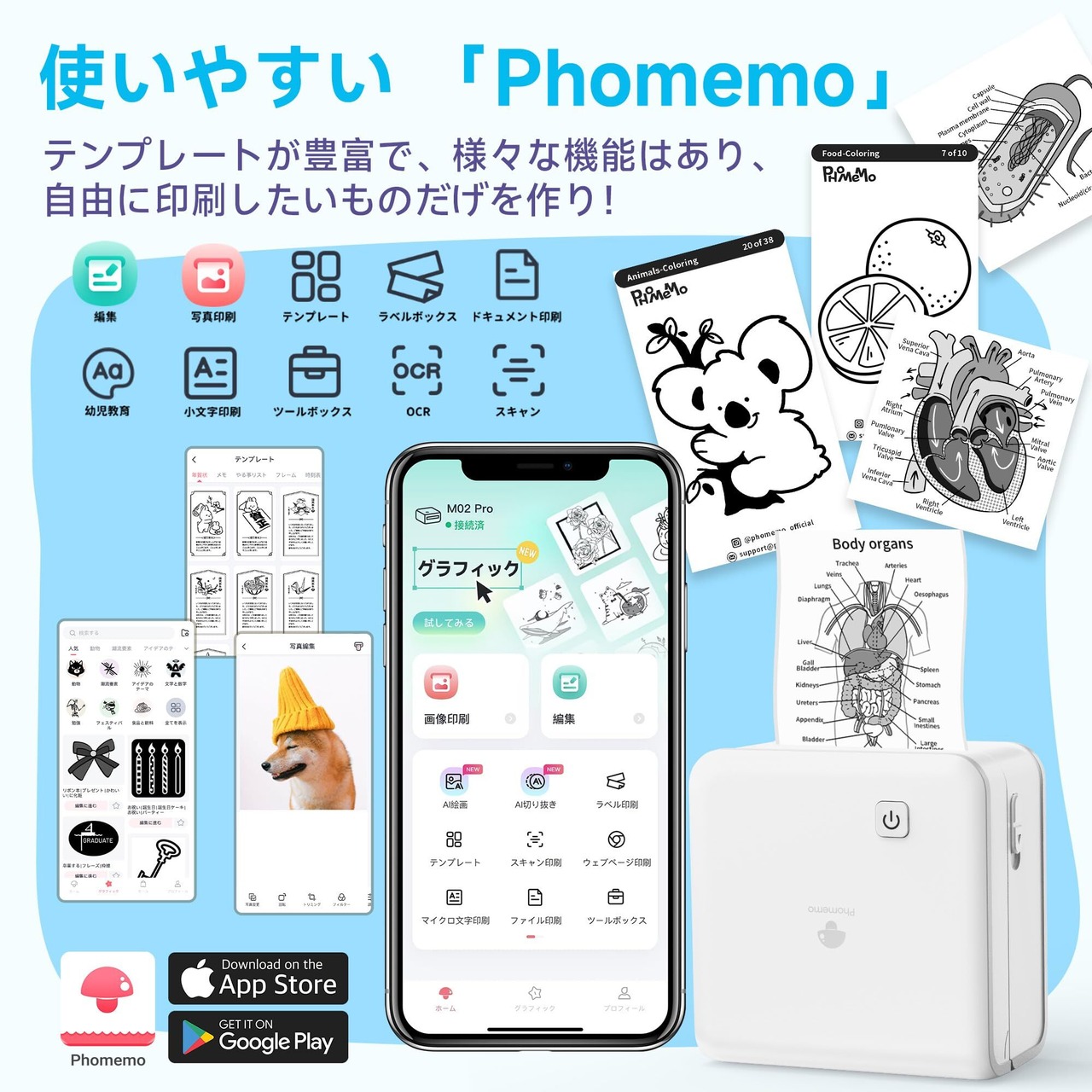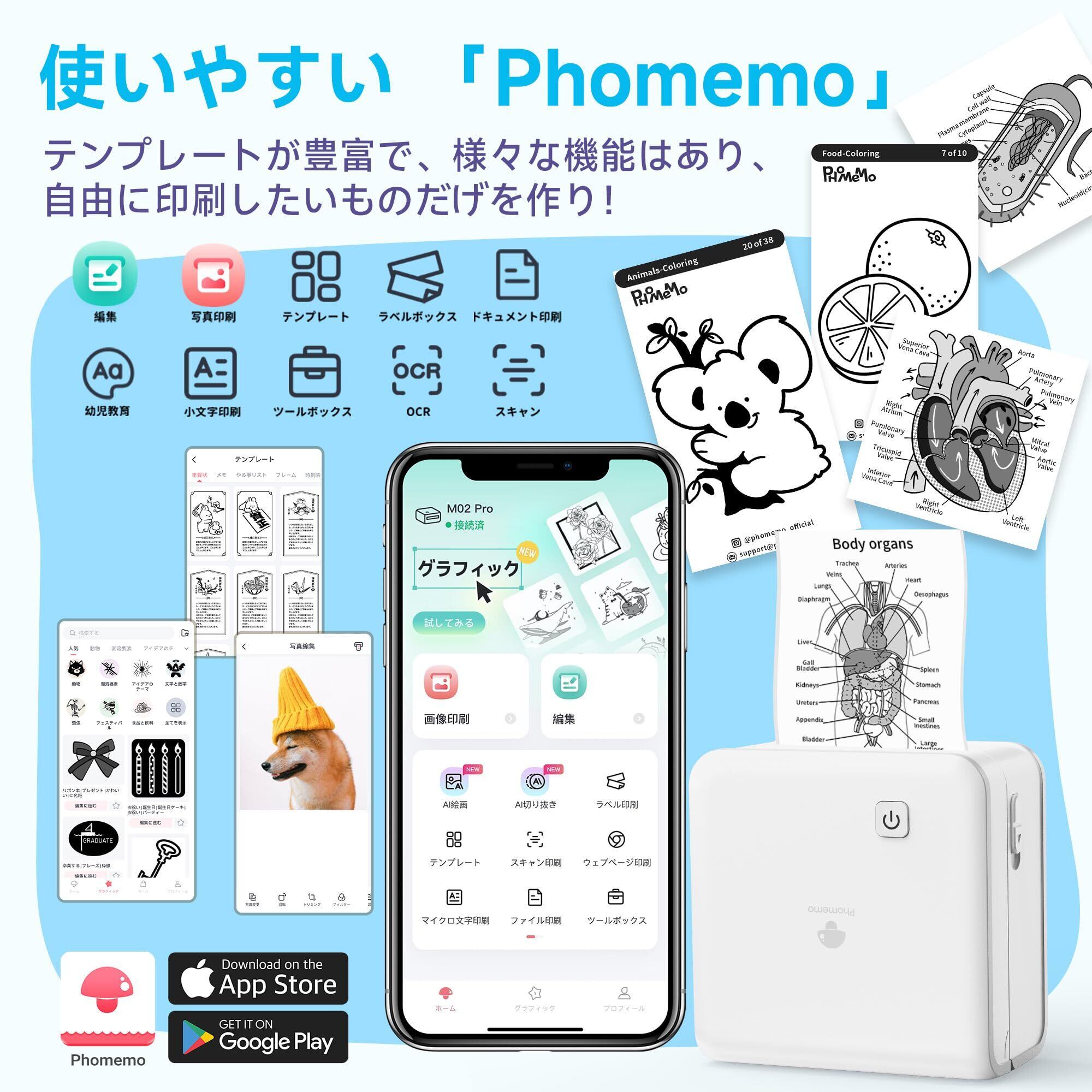 Phomemo M02 Pro 300DPI ミニプリンタ モバイルプリンター サーマルプリンター 3ロールシール付き スマホ対応 写真印刷 ポータブル型 手帳 写真/リスト/領収書/付箋/ワード/ウェブラベル/メモ/ラベル/勉強ノート 学生 友人 家族 新生活 プレゼント Bluetooth接続 在宅勤務 自宅学習 多国言語APP 日本語取扱説明書 iOS Android対応
