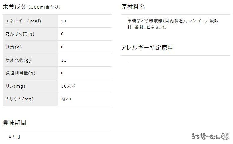原材料名:果糖ぶどう糖液糖(国内製造)、マンゴー/酸味料、香料、ビタミンC