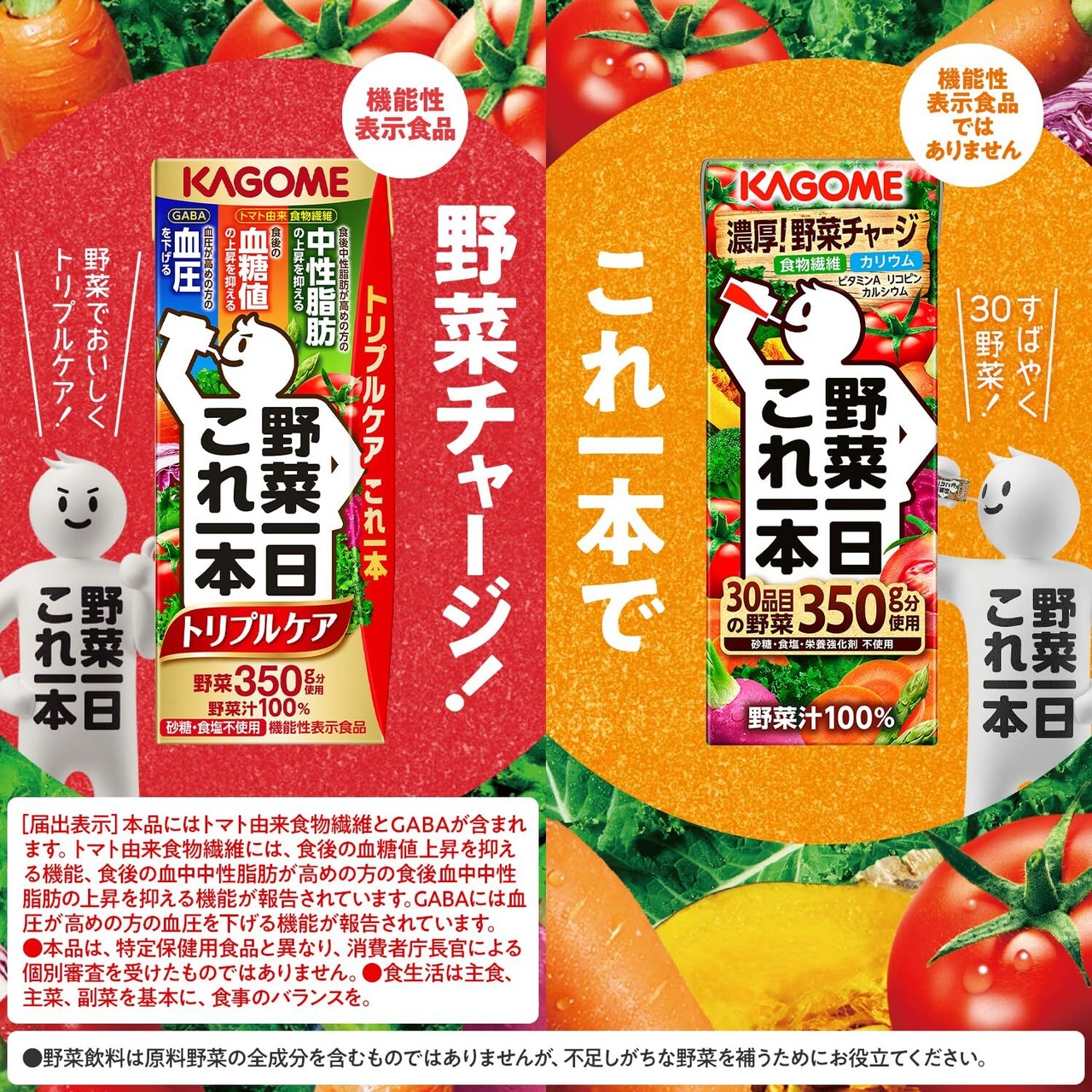 カゴメ 野菜一日これ一本トリプルケア200mlは、野菜一日これ一本トリプルケアは機能性表示食品です。本品にはトマト由来食物繊維とGABAが含まれます。トマト由来食物繊維には、食後の血糖値上昇を抑える機能、食後中性脂肪が高めの方の中性脂肪の上昇を抑える機能が報告されています。GABAには血圧が高めの方の血圧を下げる機能が報告されています。血糖値や中性脂肪、血圧が気になる方におすすめです。1日1本(200ml)を目安にお召し上がりください。