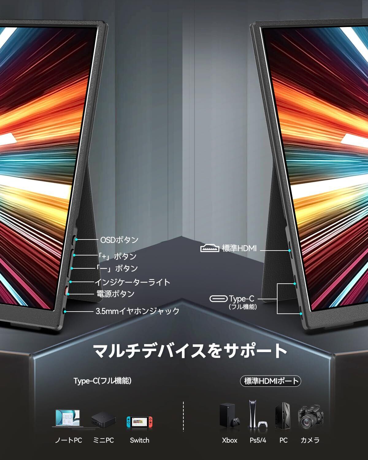 【多様な接続性】F13NA ポータブルモニターは、2つのフル機能USB Type-Cポートと一つの標準HDMIポートを備えています。優れた応答時間を誇り、特に任天堂Switch モニターとしてお勧めします。PS5、Xbox、Steam Deckなどの人気ゲーム機、そしてノートPCの拡張スクリーンやミニPCのディスプレイとして簡単に接続できます。※Switch 2はHDMI接続でご使用ください。