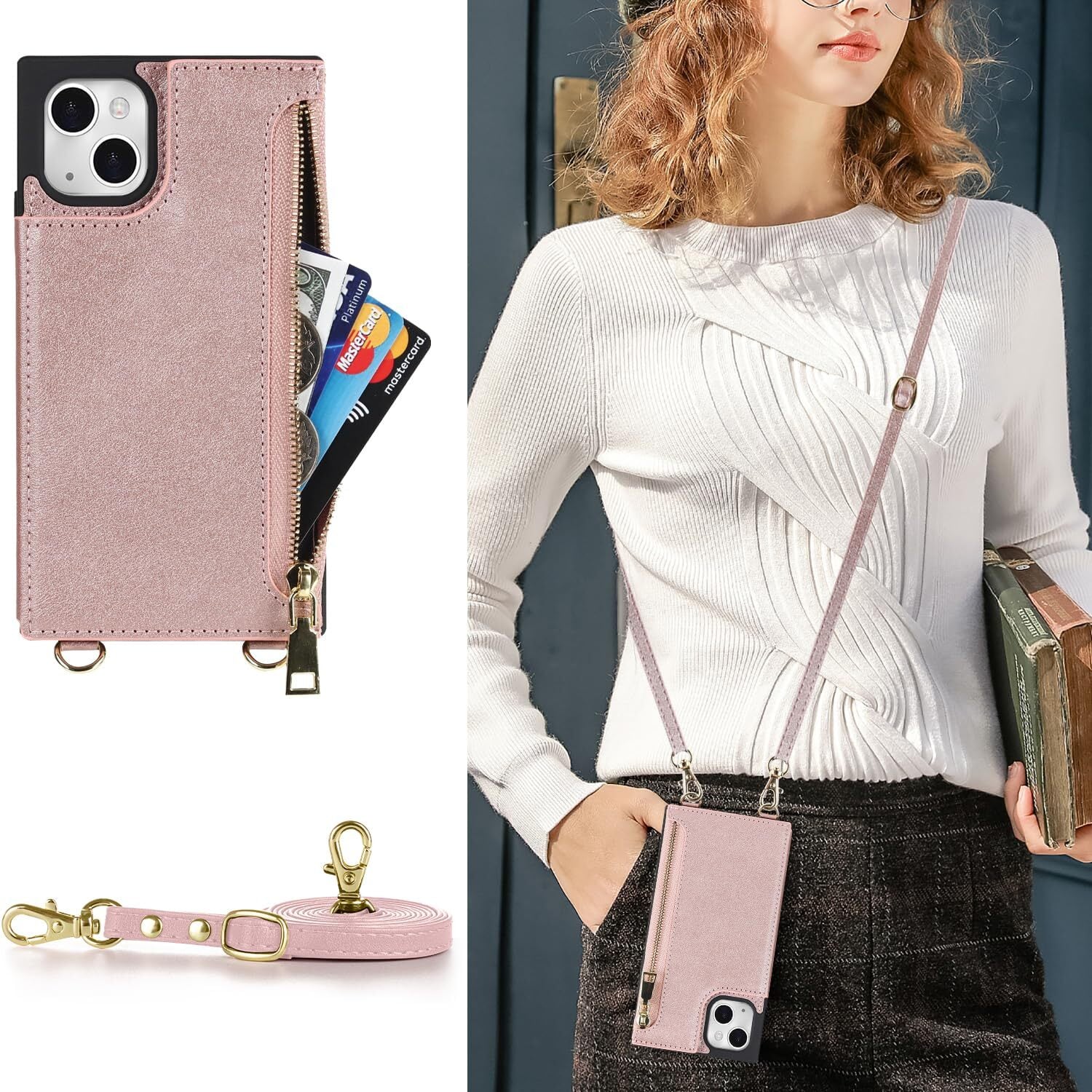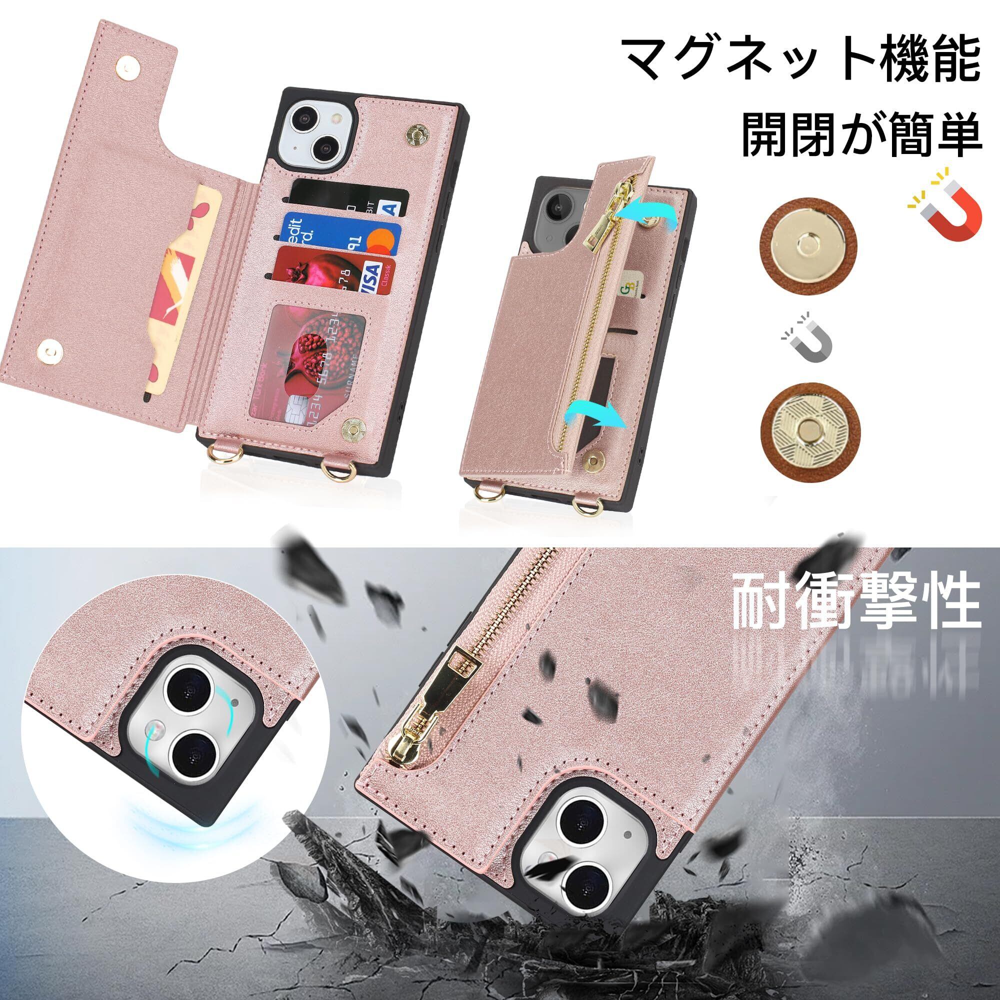 NODALA iPhone 14 plusケース 手帳型 背面収納 ショルダー あいふぉん14 ぷらす カバー アイフォ14 プラス ケース 財布型 いphone14 plus スマホケース 肩掛け 斜めがけ 首かけ ストラップ付き 長さ調整可能 携帯ケース おしゃれ カード収納 左右開 耐衝撃 ステント機能 ピンク