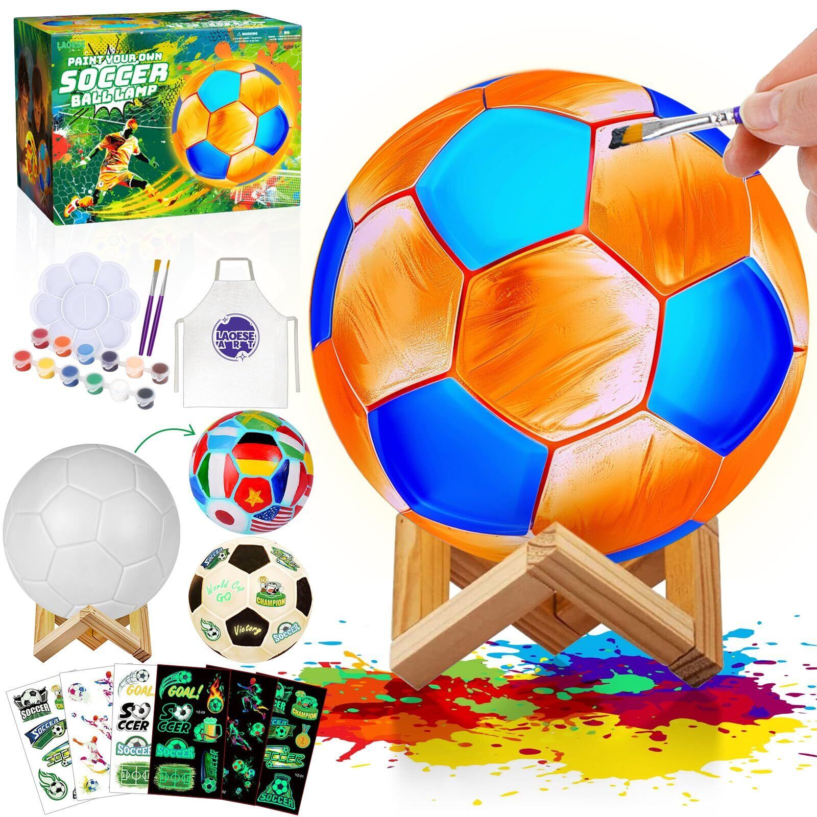 【セット内容】サッカーランプ、絵の具セット、画筆2本セット、パレット1個、スタンド1個、シール3ページ。
