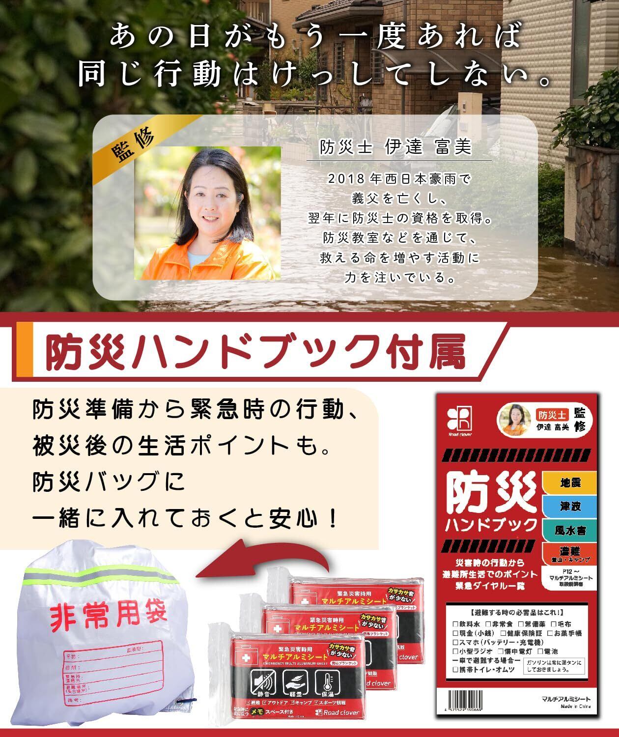 このマルチアルミシート(サバイバルシート)は、現役防災士の監修により開発されました。防災ハンドブックが付属しており、災害対策から被災後の生活支援に至るまで、防災グッズとしても広範な知識が提供されています。また、専用の収納袋が付属し、さらにパッケージにメモ領域が設けられているなど、防災士による経験豊かな智恵が活かされています。