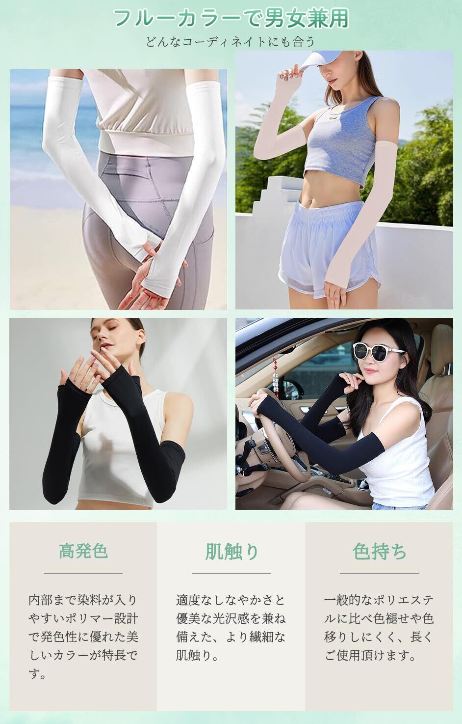 【接触冷感&ロング丈設計】接触冷感素材を採用しており、肌に触れた瞬間にひんやりとした涼感をご体感いただけます。汗や水分が蒸発する際の気化熱によって、さらに冷却効果が高まります。ロング丈(平置き49cm)で、肩下までしっかりとカバー。Tシャツと合わせることで、手軽に腕全体の紫外線対策が可能です。