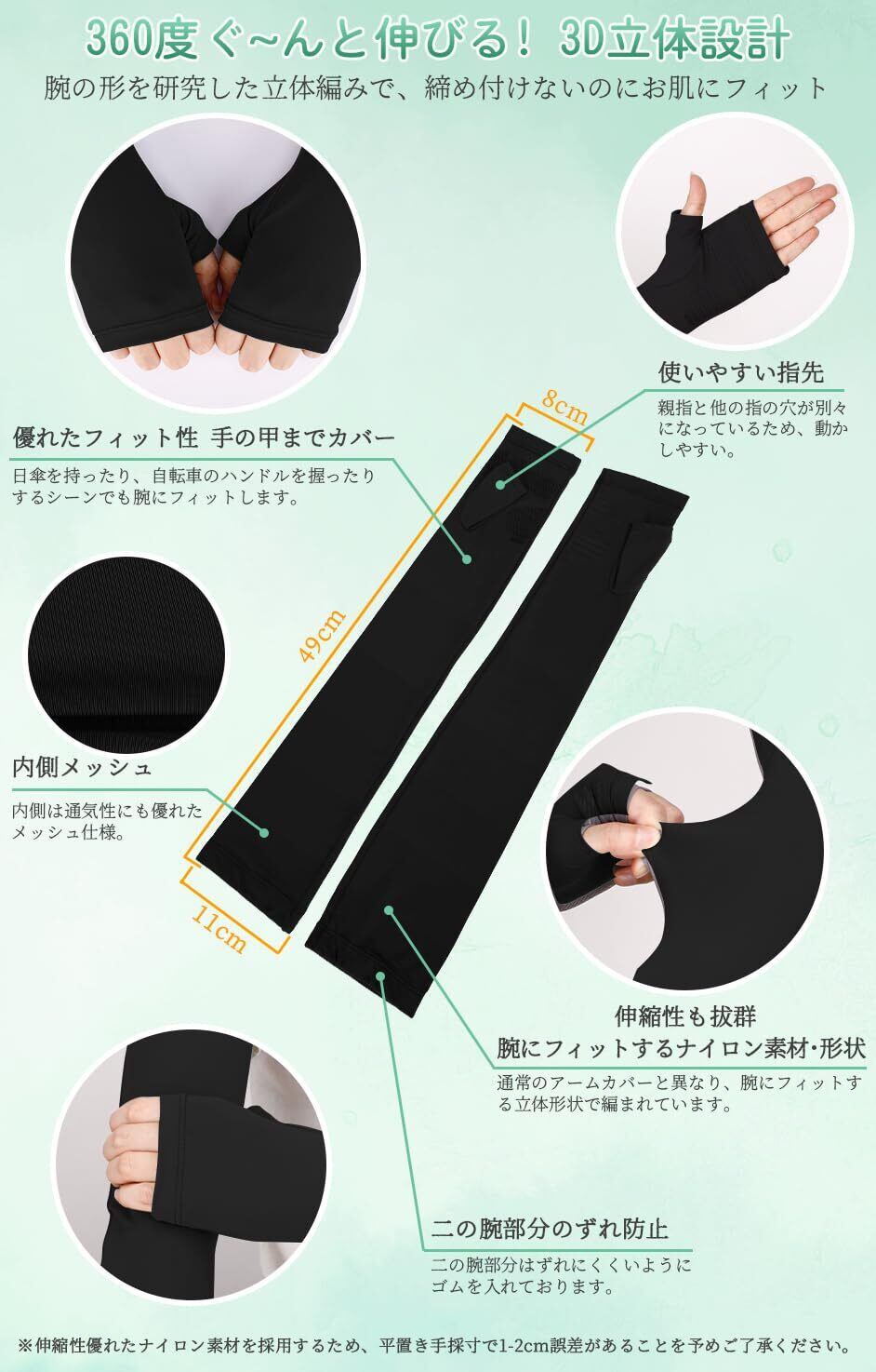 【UVカット率99%・UPF50+対応】本製品はUVカット率99%以上、生地はUPF50+の高い紫外線防止性能を備えております。強い日差しの中でも、腕をしっかりと保護いたします。日焼け止めと併用することで、より効果的な紫外線対策が期待できます。