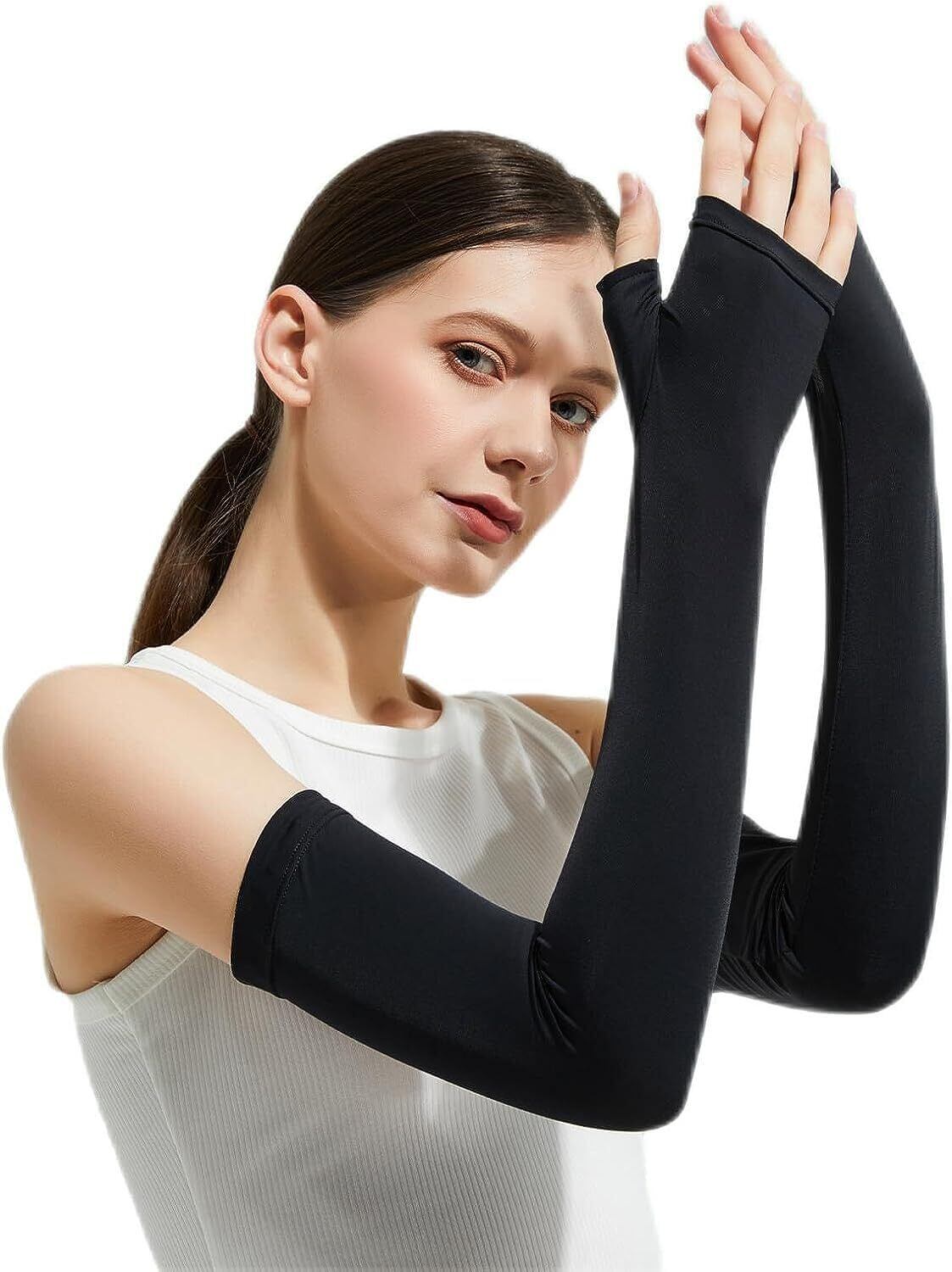 [DEWEL] UPF50+・冷感ひんやり アームカバー UVカット レディース メンズ 指穴付き ロング丈 腕カバー 日焼け防止 吸汗速乾 滑り止め 冷感アームカバー アウトドア/自転車/ゴルフ用(両腕2枚組・ブラック)