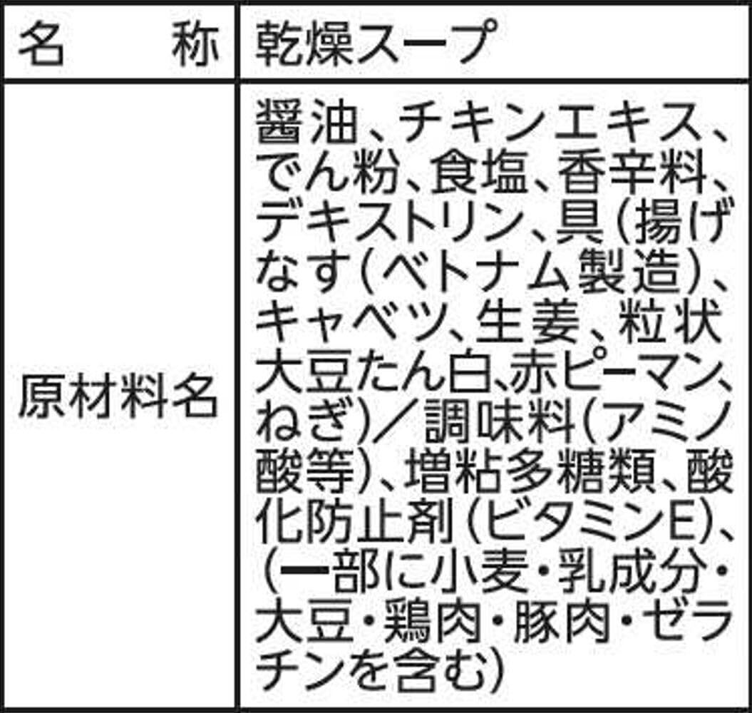 醤油、チキンエキス、でん粉、食塩、香辛料、デキストリン、具(揚げなす(ベトナム製造)、キャベツ、生姜、粒状大豆たん白、赤ピーマン、ねぎ)/調味料(アミノ酸等)、増粘多糖類、酸化防止剤(ビタミンE)、(一部に小麦・乳成分・大豆・鶏肉・豚肉・ゼラチンを含む)
