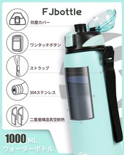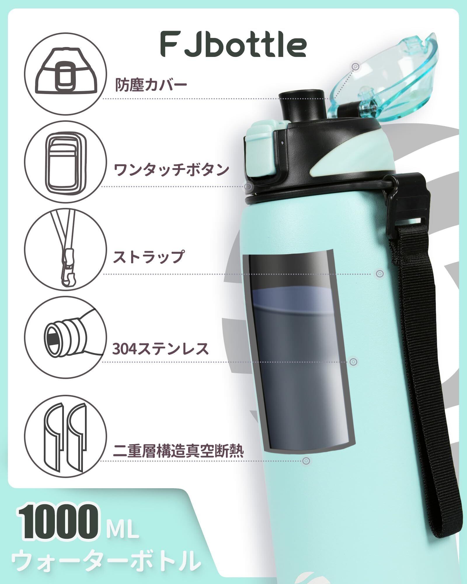 FJbottle 水筒 1リットル 真空断熱 ワンタッチ スポーツボトル 1L 保温 保冷 スポーツ飲料対応 広口 洗いやすい ステンレスボトル 水筒カバー 洗浄用スポンジ付き 女の子 男の子 おしゃれ 大人 子供 ティファニーブルー
