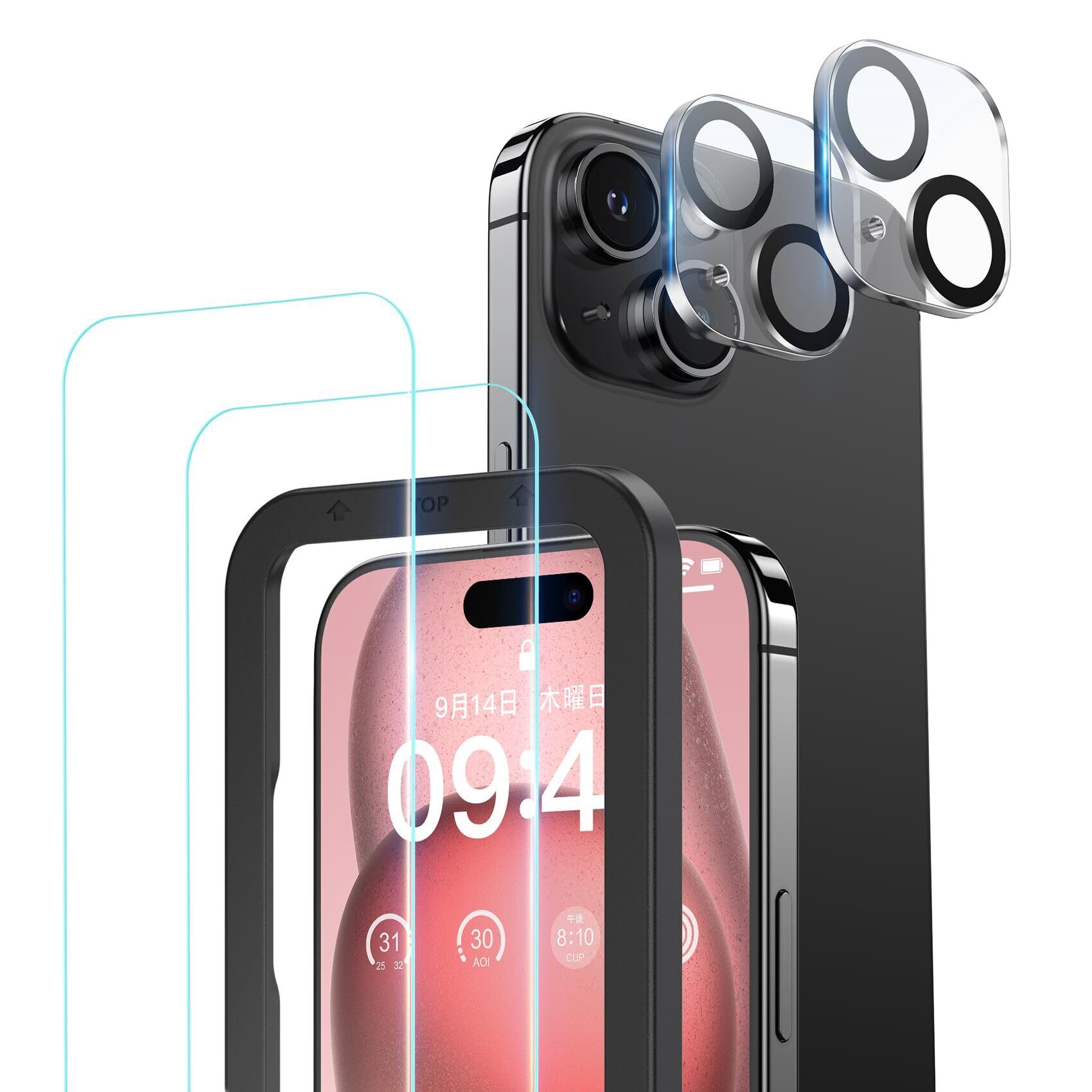 NIMASO ガラスフィルム (2枚) + カメラフィルム (2枚) iPhone15用 強化ガラス 保護フィルム ガイド枠付き カメラ保護 レンズカバー 硬度9H 耐衝撃 自動吸着 アイフォン15対応(6.1インチ) NFP23H713