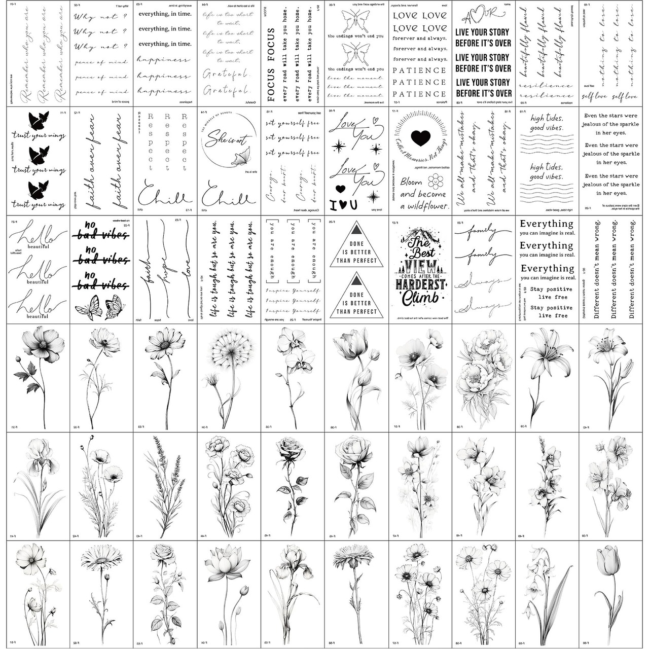 サイズとデザイン:各シートの大きさは6x10cm(2.3インチx3.9インチ)です。 これらの半永久的な防水フェイクテンポラリータトゥーセットは、顕現を肯定する言葉や引用、そして美しいスタイリッシュで上品な花柄のデザインの両方に最適です。 多くの強力で意味のあるスクリプトフレーズや文字だけでなく、バラ、牡丹、ユリ、デイジー、ポピーなどのさまざまな野生の花のデザインもあります。