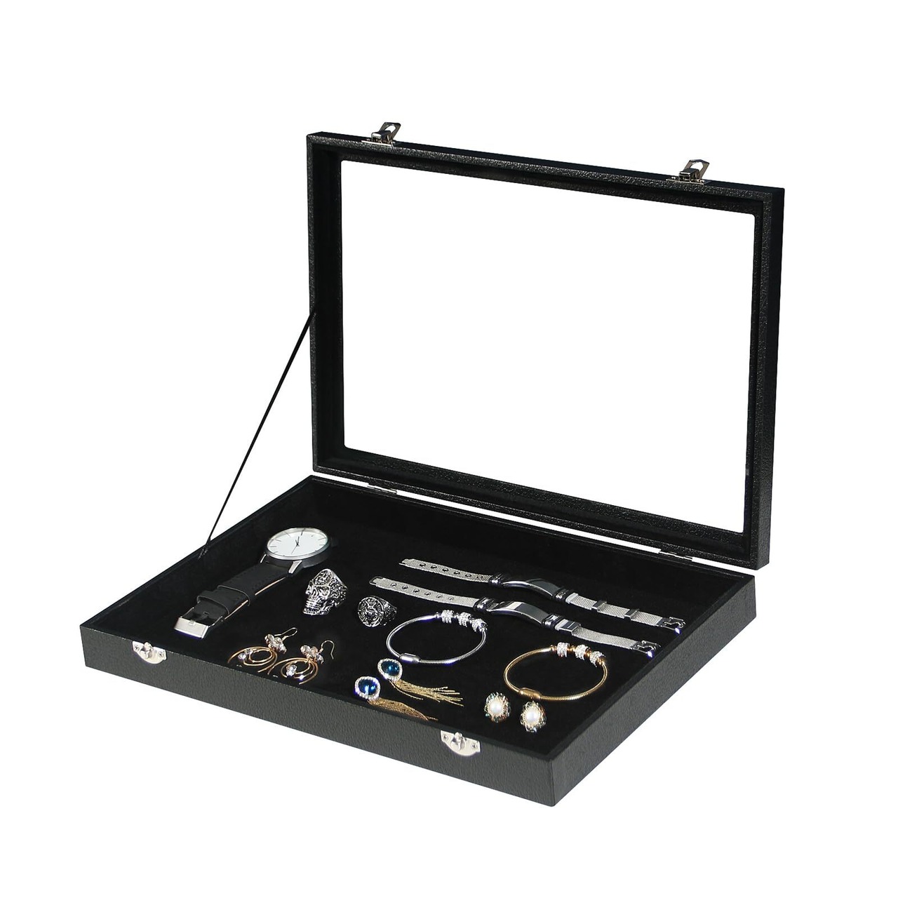安価なプラスチックの蓋の代わりに、ジュエリーケースの上部にある厚い透明なガラス窓があり、すべてのジュエリーを一目で確認できます。