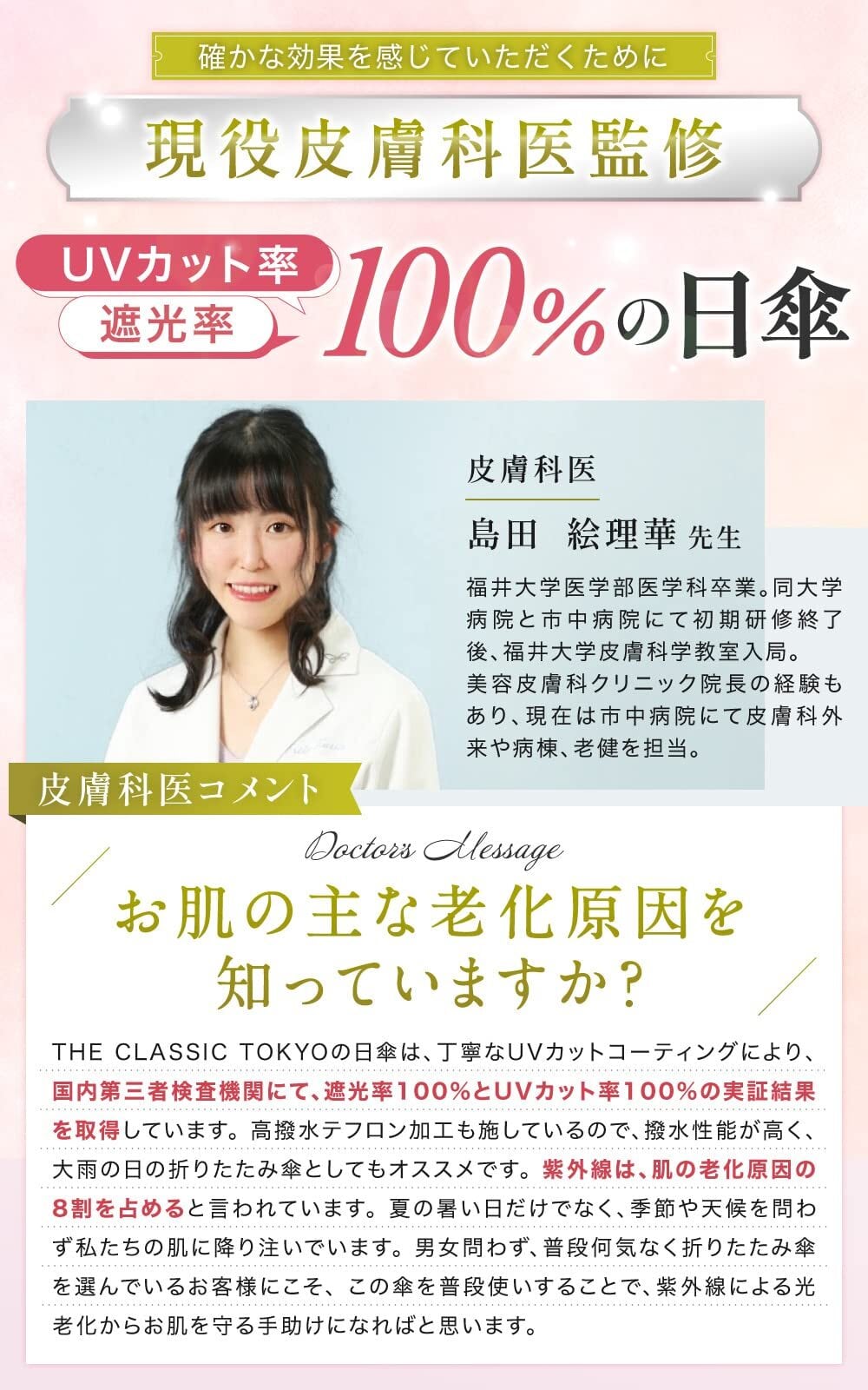【国内第三者検査機関にてUVカット率100%の認証済】日本の国家規格、JIS規格1925にてUVカット率100%を認証。JIS規格1055にて遮光率100%の認証済み!完全遮光の超軽量コンパクトな日傘です。