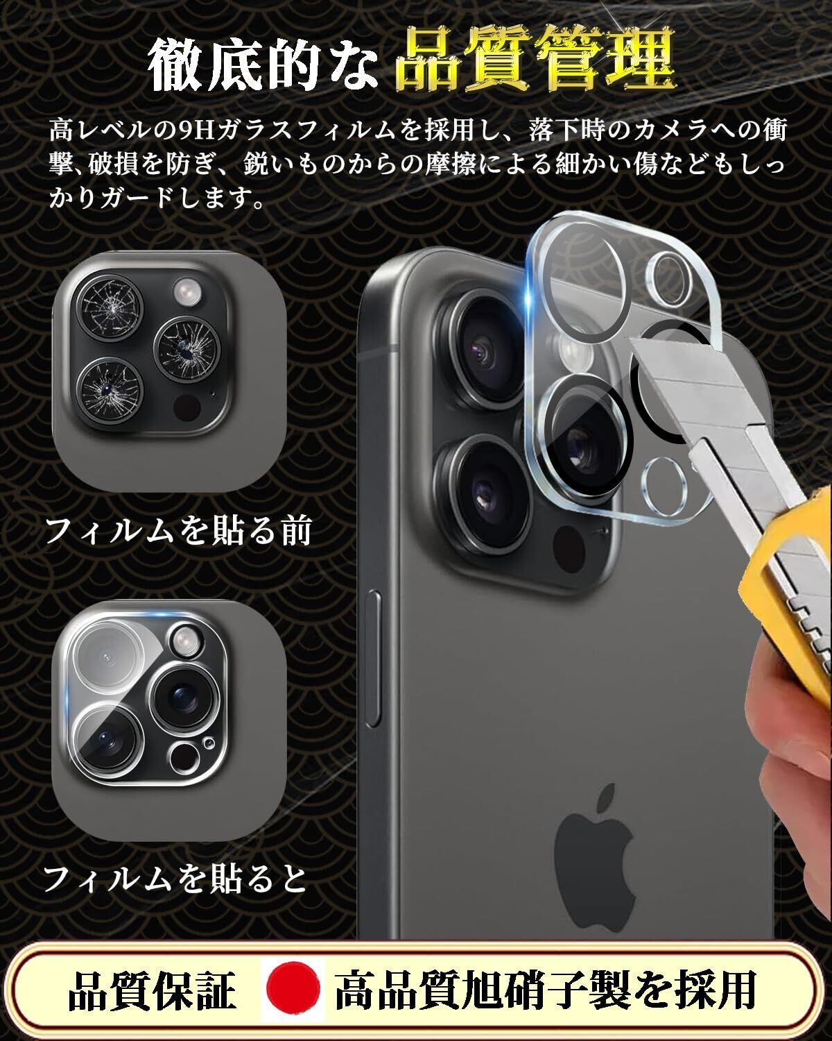 iPhone 15 Pro/iPhone 15 ProMax カメラフィルム iPhone 15 Pro / 15 ProMax カメラカバー 日本製素材旭硝子製 露出オーバー防止 指紋防止 硬度9H 気泡防止 飛散防止 高透過率 貼り付け簡単 キズ防止 極薄 全面保護 アイフォン15 Pro / 15 ProMax レンズ フィルム【2枚】