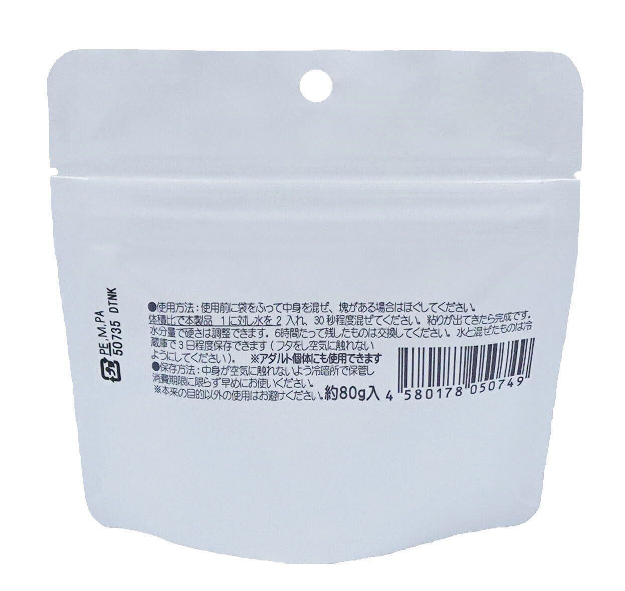体積比で本製品1に対して水を2入れ30秒ほどよく混ぜたら完成です。硬さは水分量で調整できます。マドラーやシリンジ、置きエサなどで与えることができます。