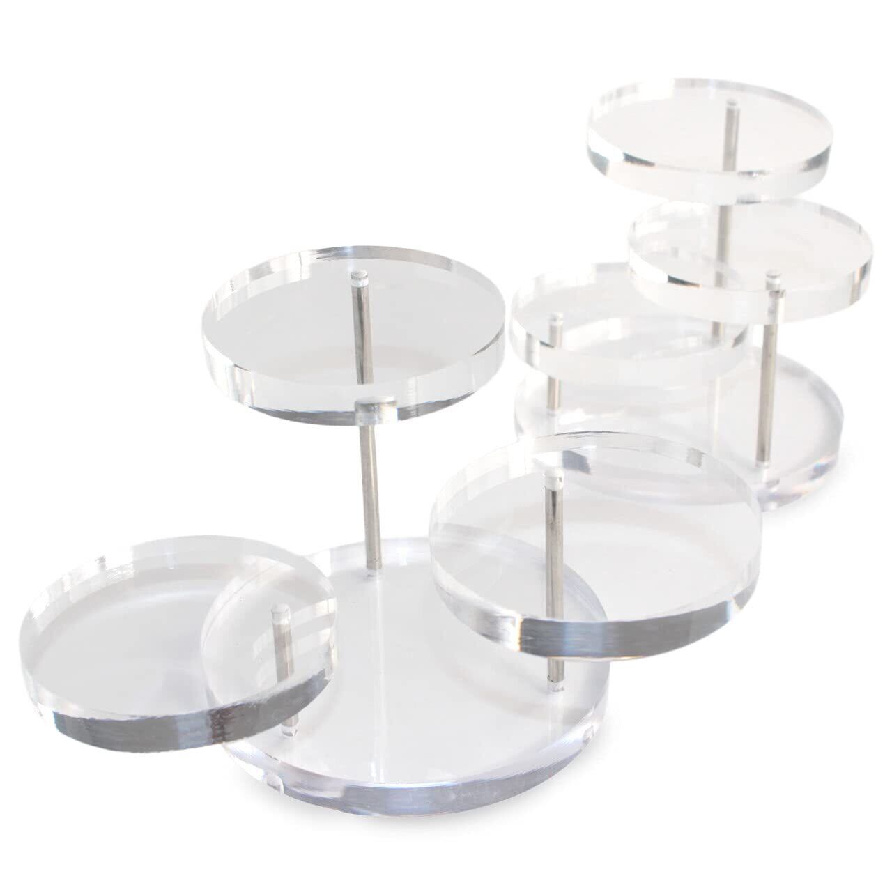 【素材】アクリル 、ステンレス鋼 【カラー】ブラック、クリア(同色2個セット) 【サイズ】 高さ:7cm 土台直径:約7.1cm トレイ(3段共):直径約5.1㎝ トレイ・土台厚さ:クリア約0.75㎝ ※円の台は、稼働しますが高さは、固定です。
