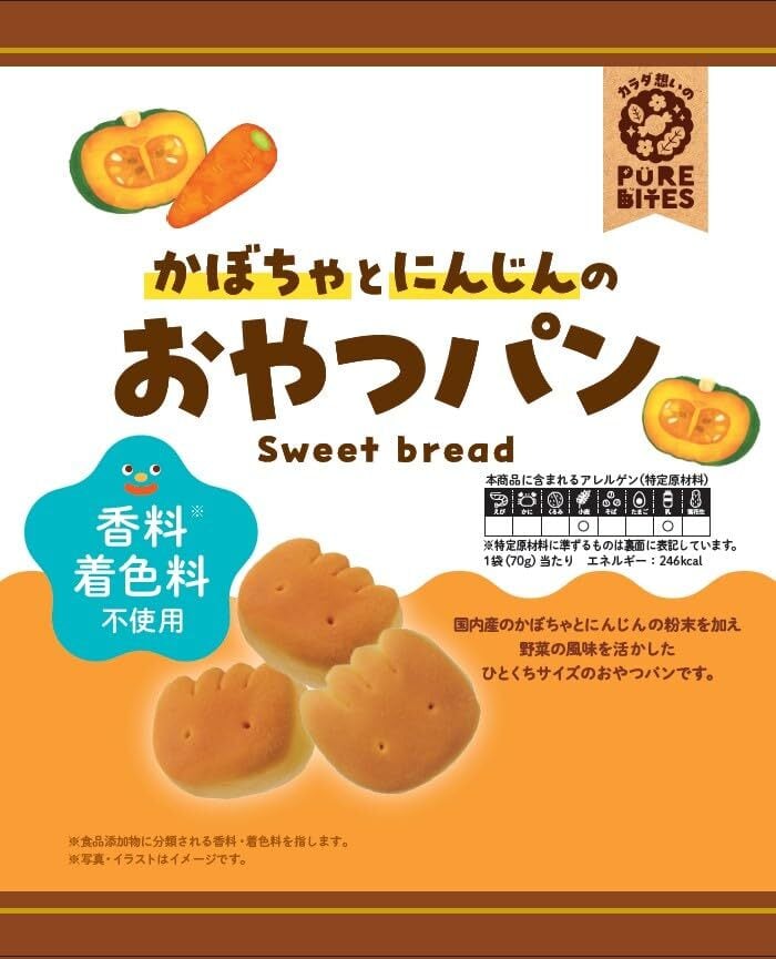商品説明:家族のからだを想うPURE BITES(ピュアバイツ)シリーズです。自然(PURE)な素材の美味しさで、食べたら止まらないひとくちサイズのおやつ(BITES)です。国内産のかぼちゃとにんじんの粉末を加えた野菜の風味と栄養が活きたおやつパンです。