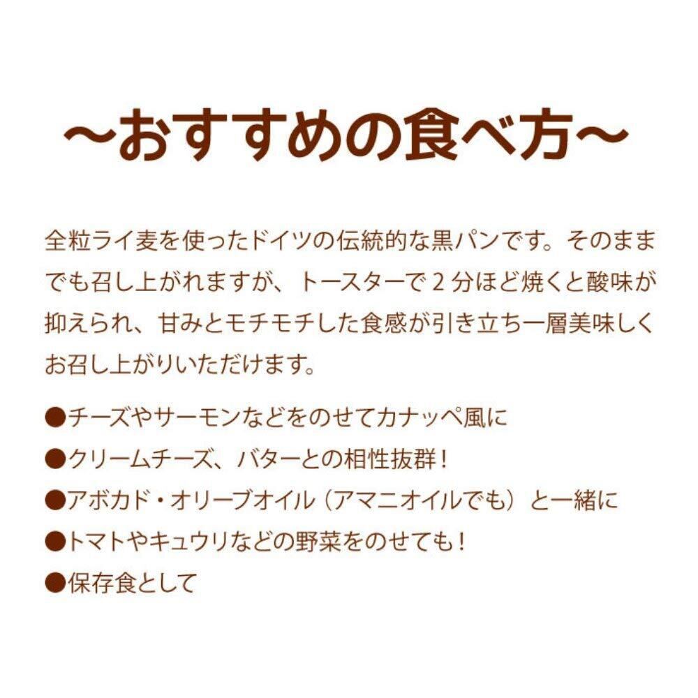 チーズやトッピングを載せてお召し上がり下さい。また、ジャムの他、ソーセージやハム、スープ、サラダ等との相性が良く、毎日の健康的な食事メニュー作りに。 外皮・芽をまるごと含んだ、有機全粒ライ麦には、ビタミン・ミネラル・食物繊維がバランスよく含まれており、特に現代人に不足しがちな食物繊維が豊富で、このライ麦パンを2枚食べることで、成人女性が1日に必要とする量の半分(10g)を満たすことができます。