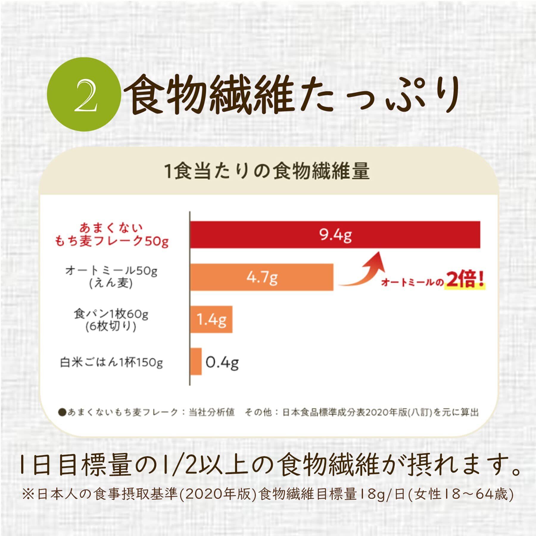 "もち麦を浅焼き焙煎してフレークにしました。 身体にやさしく、身体においしい、あまくないシンプルなシリアルです。 1食(50g)で、食物繊維が9.4gと1日の目標量の1/2以上を摂ることができます。(日本人の食事摂取基準2020年版より) 普段のヨーグルトや牛乳に振りかけて召し上がってください。 また、サラダのトッピングや、揚げ物の衣、おかずにトッピングしてアクセントとして楽しむこともできます。 1食(50g)当たり エネルギー184kcal タンパク質6.5g 脂質2.0g 炭水化物39.6g(糖質30.2g 食物繊維9.4g) 食塩相当量0g"