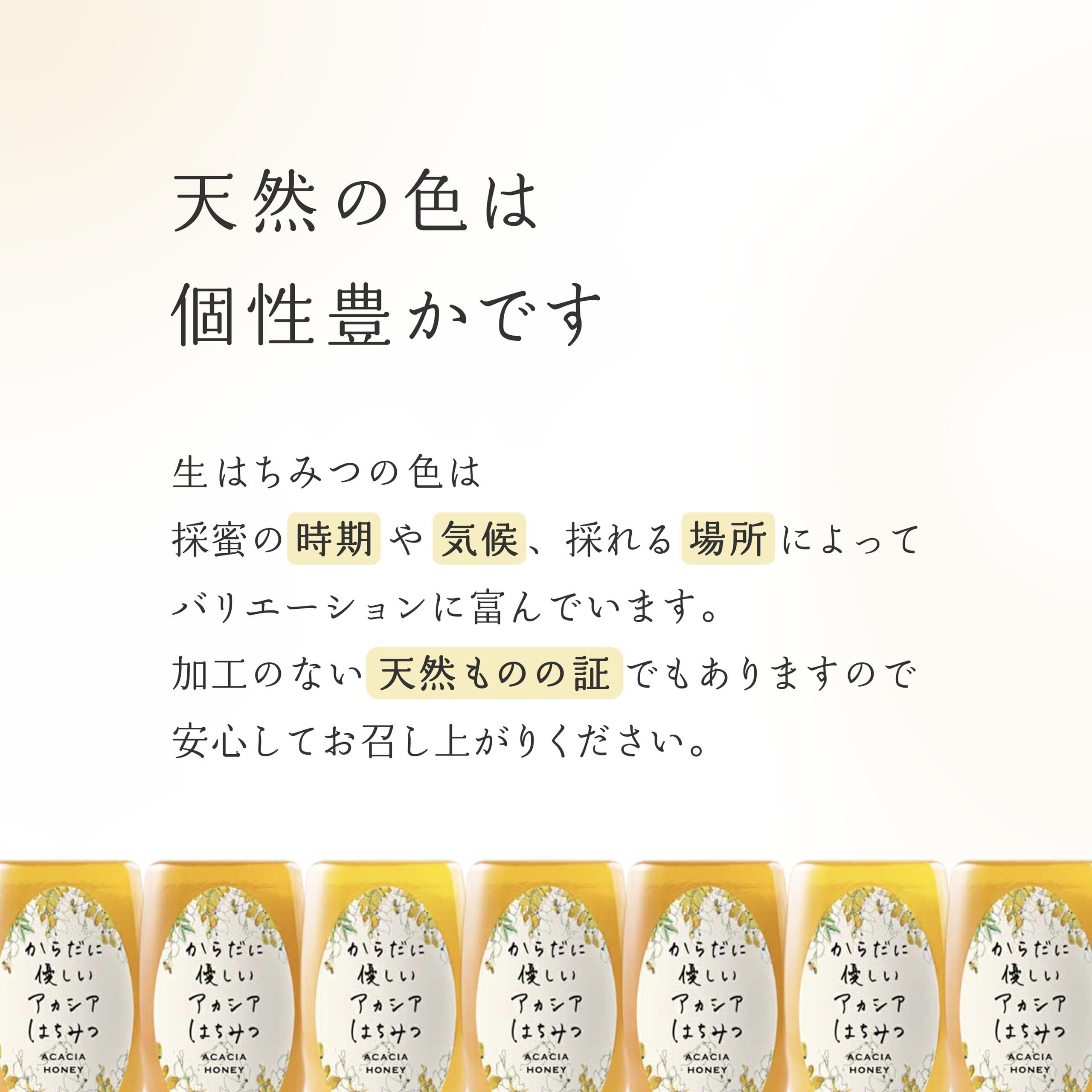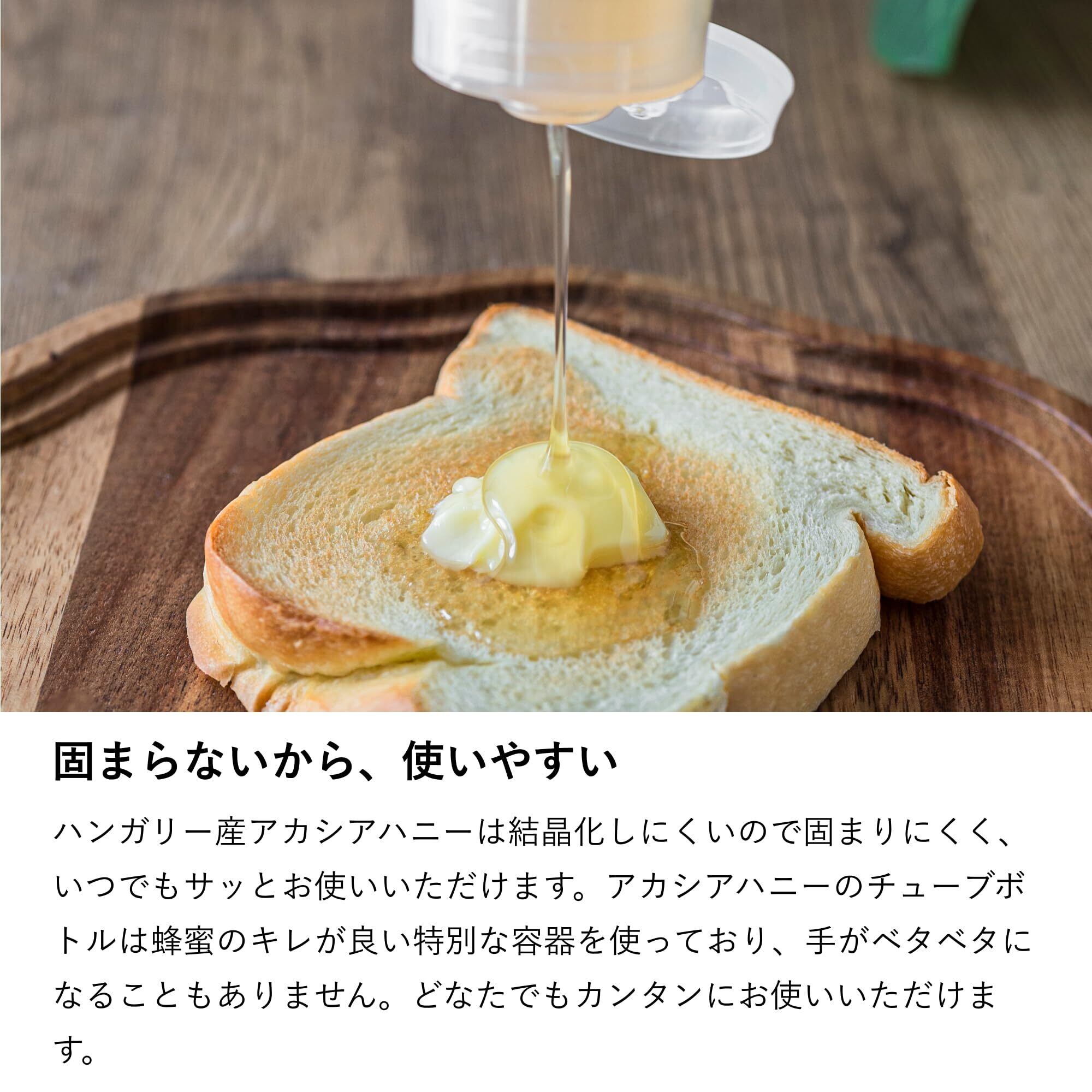 【固まらないから、使いやすい】ハンガリー産アカシアハニーは結晶化しにくいので固まりにくく、いつでもサッとお使いいただけます。アカシアハニーのチューブボトルは蜂蜜のキレが良い特別な容器を使っており、手がベタベタになることもありません。どなたでもカンタンにお使いいただけます。