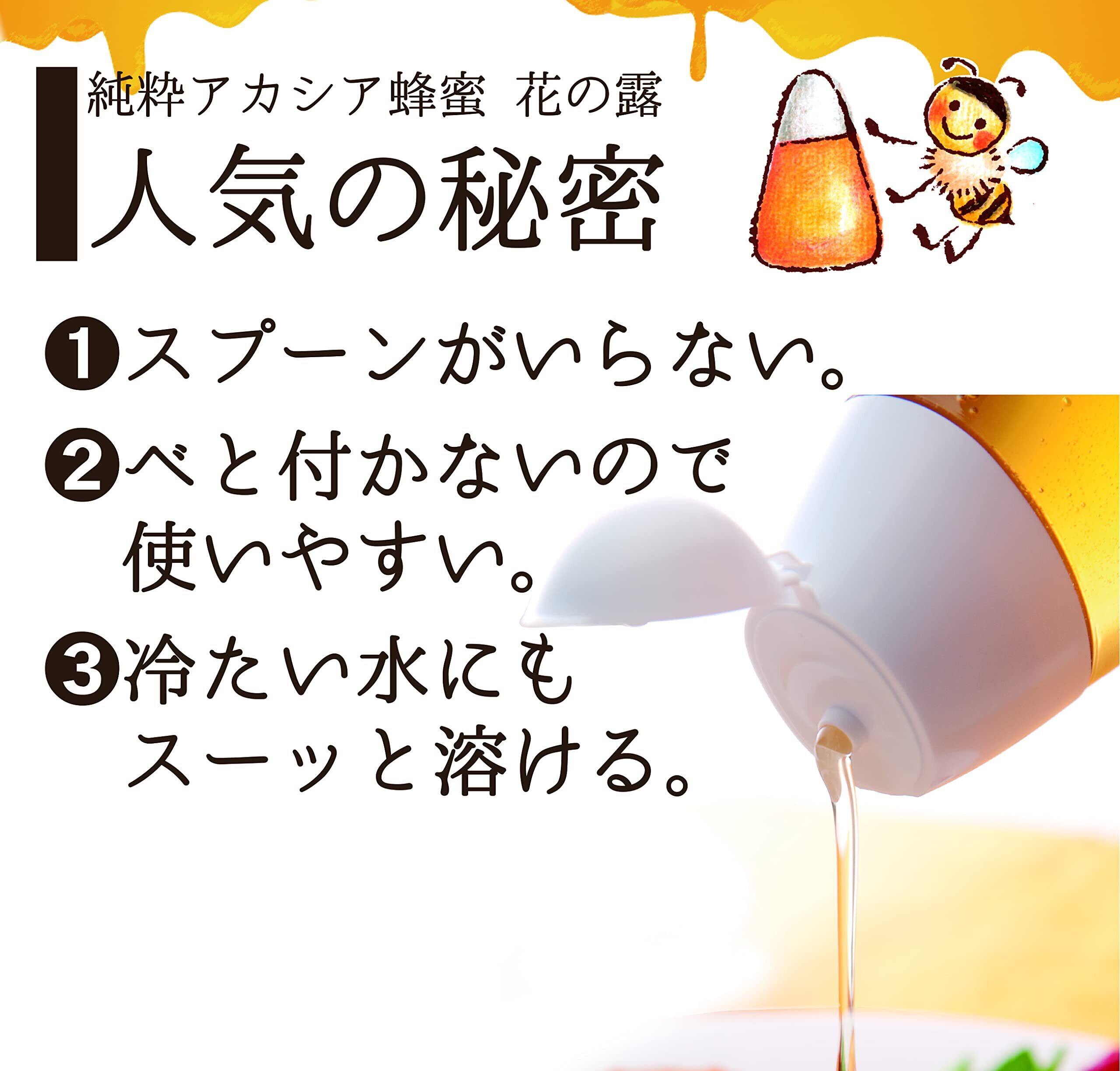 武州養蜂園のアカシア蜂蜜 花の露キッチンボトルは、サラっとしていて、冷たいものにも溶けやすいのが特徴です。容器はボトルタイプで、片手で使えます。スプーン不要で手にベトつかないため、お料理にも便利なのが人気の秘密です。