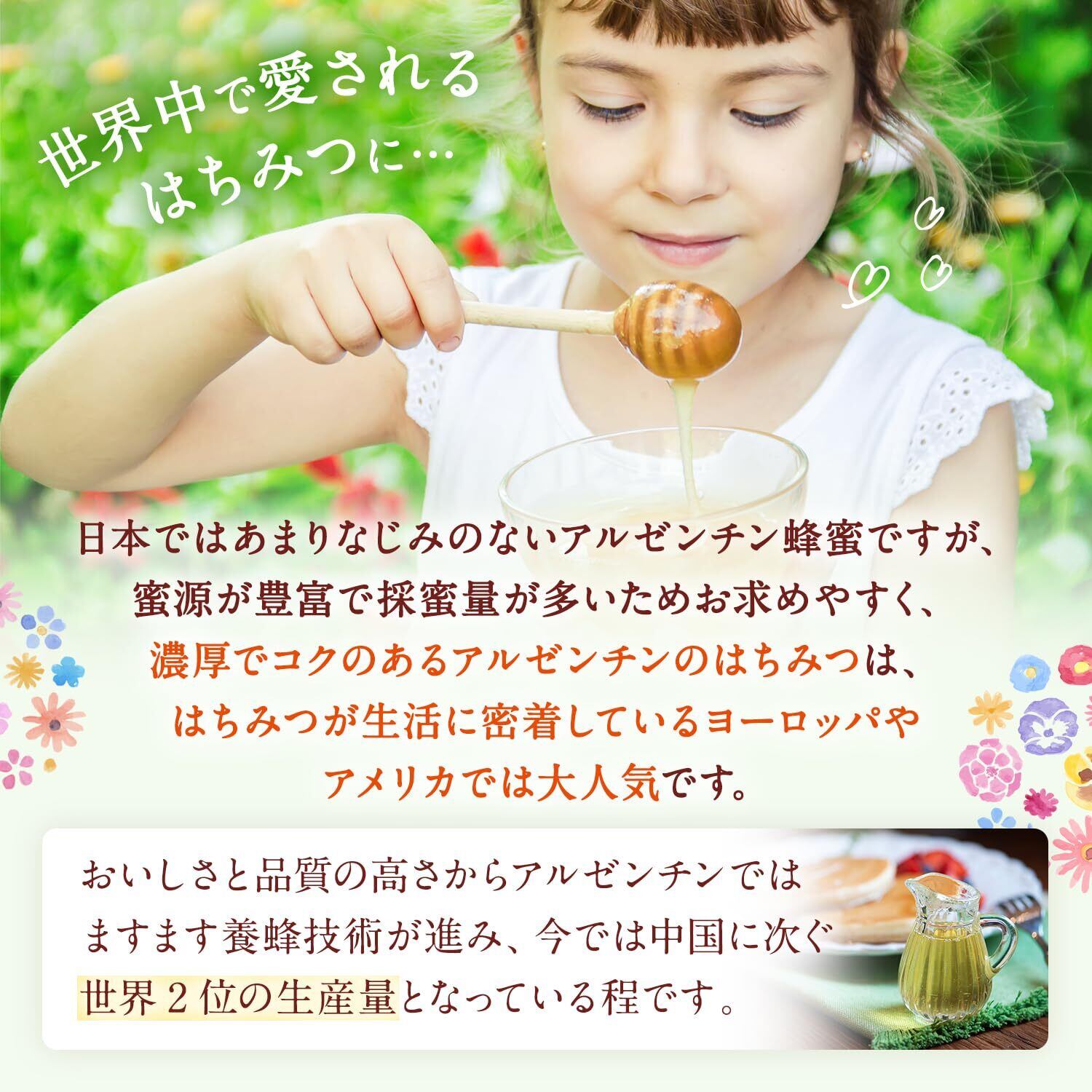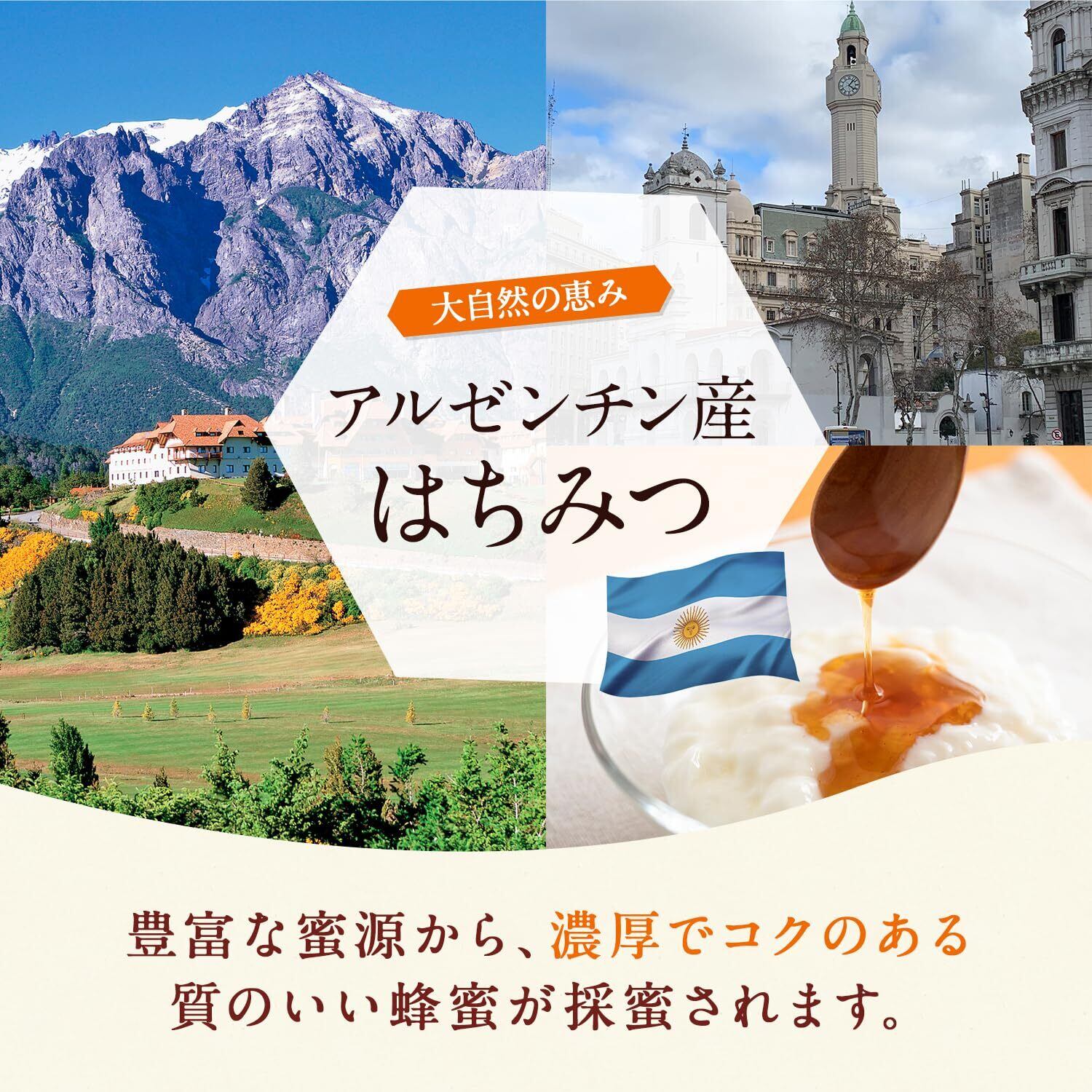【広大な自然に恵まれた、アルゼンチン産ハチミツ】大自然に囲まれ、蜜源が豊富なアルゼンチンでは、たくさんの花から質の良いはちみつが採蜜されます。パンパと呼ばれる大草原地域を中心に定置養蜂が行われています。おいしさと品質の高さからアルゼンチンでは、ますます養蜂技術が進み今では、中国に次ぐ世界2位の生産量となっている程です。