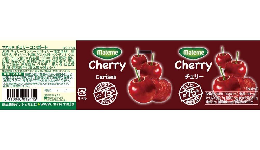 原材料:チェリー、砂糖/ゲル化剤(ペクチン)、クエン酸、クエン酸Ca