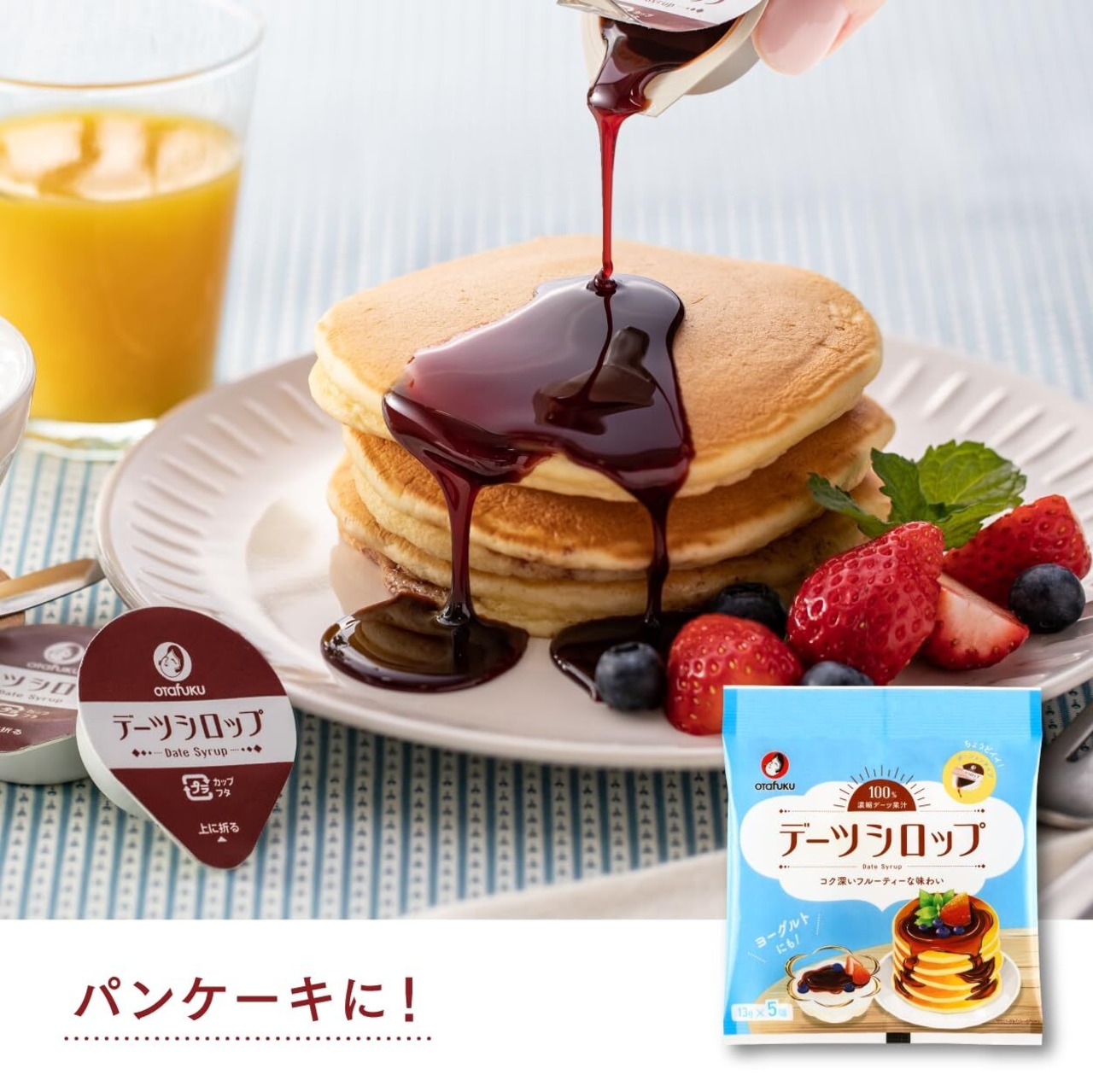 砂糖などは使用せず、デーツの加熱加工のみのシンプルな製造方法で、デーツ本来の甘さを活かした味わいです。はちみつとメープルシロップの中間にあたるほどよい“とろみ”は、ホットケーキなどのトッピングのほか、砂糖の代わりとしても様々な料理にお使いいただくことができます。