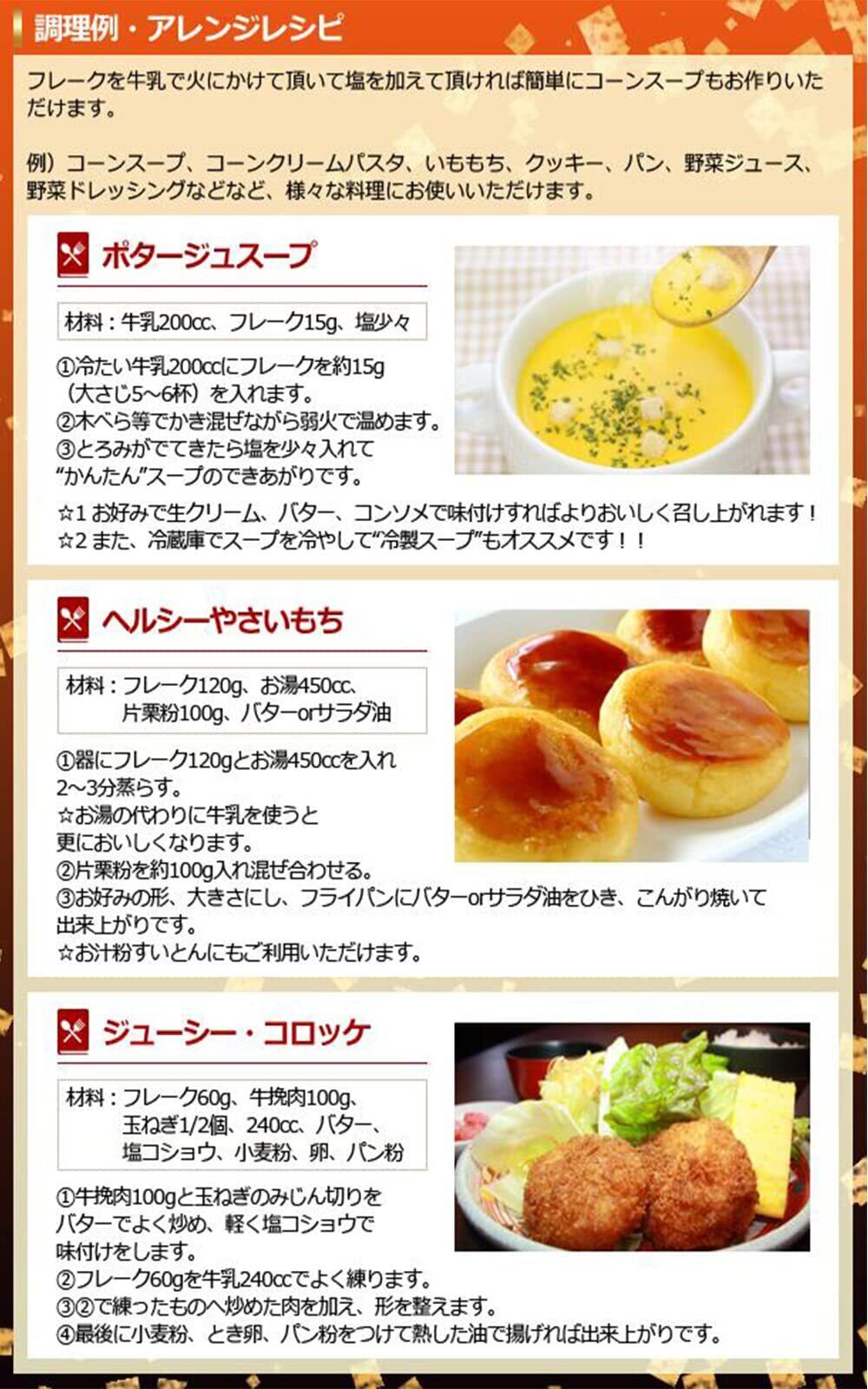 【ユウテックの野菜フレーク】ユウテックの「とうもろこしフレーク」は北海道紋別産の糖度14度以上のとうもろこしを使用。フレークの溶けの良さ、なめらかな舌触り、素材の持つ美味しさをお楽しみください。水やミルクで混ぜるだけで簡単に裏ごし野菜が出来上がります。