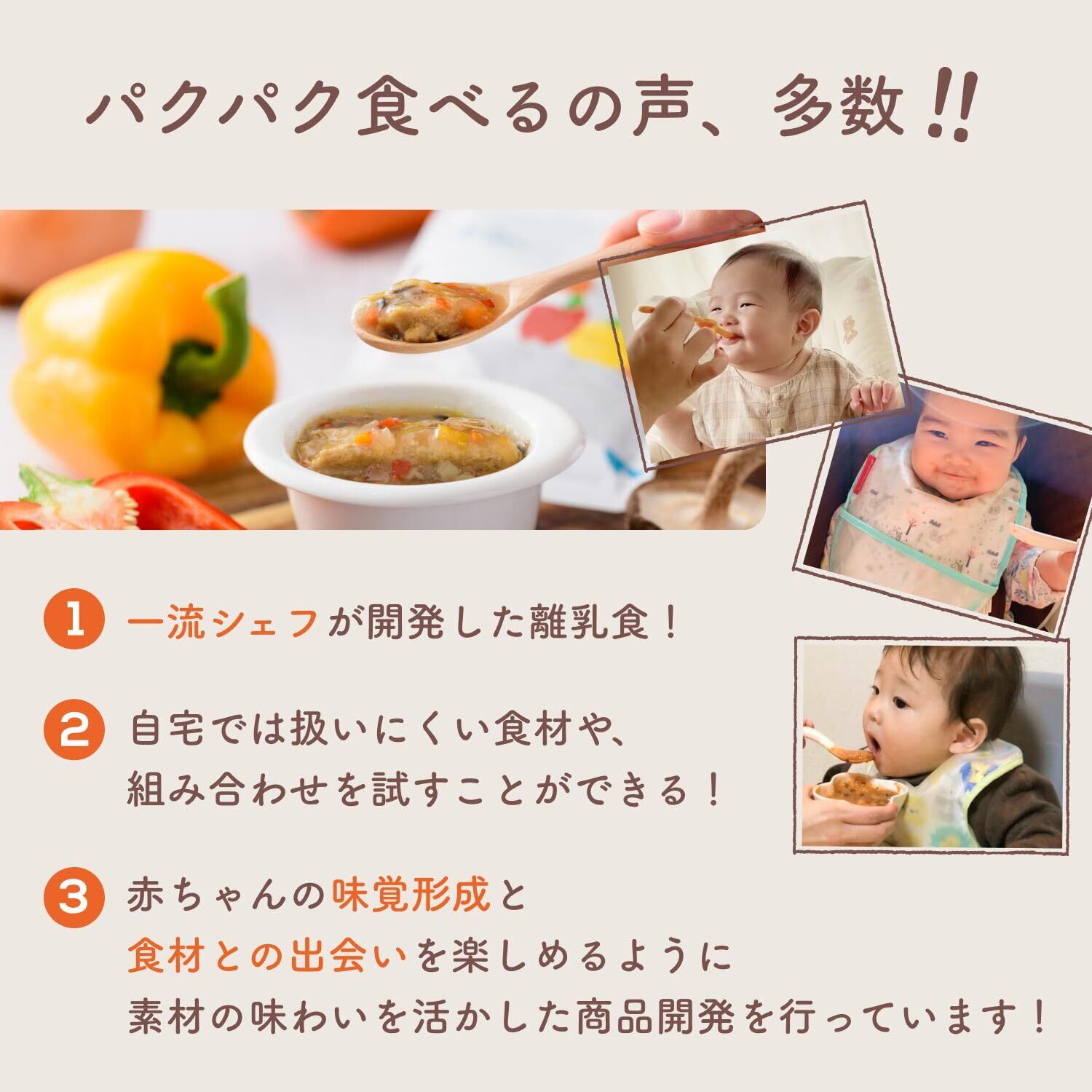 [本格的なメニューで幅広い味覚体験を]9ヶ月 頃~始まる かみかみ期 を楽しく迎えられるように、こだわりの食材をふんだんに使用!さらに一流シェフ監修の元、素材本来の味を活かした調理法を採用しています。はじめての食感、味にチャレンジする 赤ちゃん には「楽しく美味しく 栄養 があるものをあげたい」。そんなママパパにおすすめの 簡単 ベビーフード です。