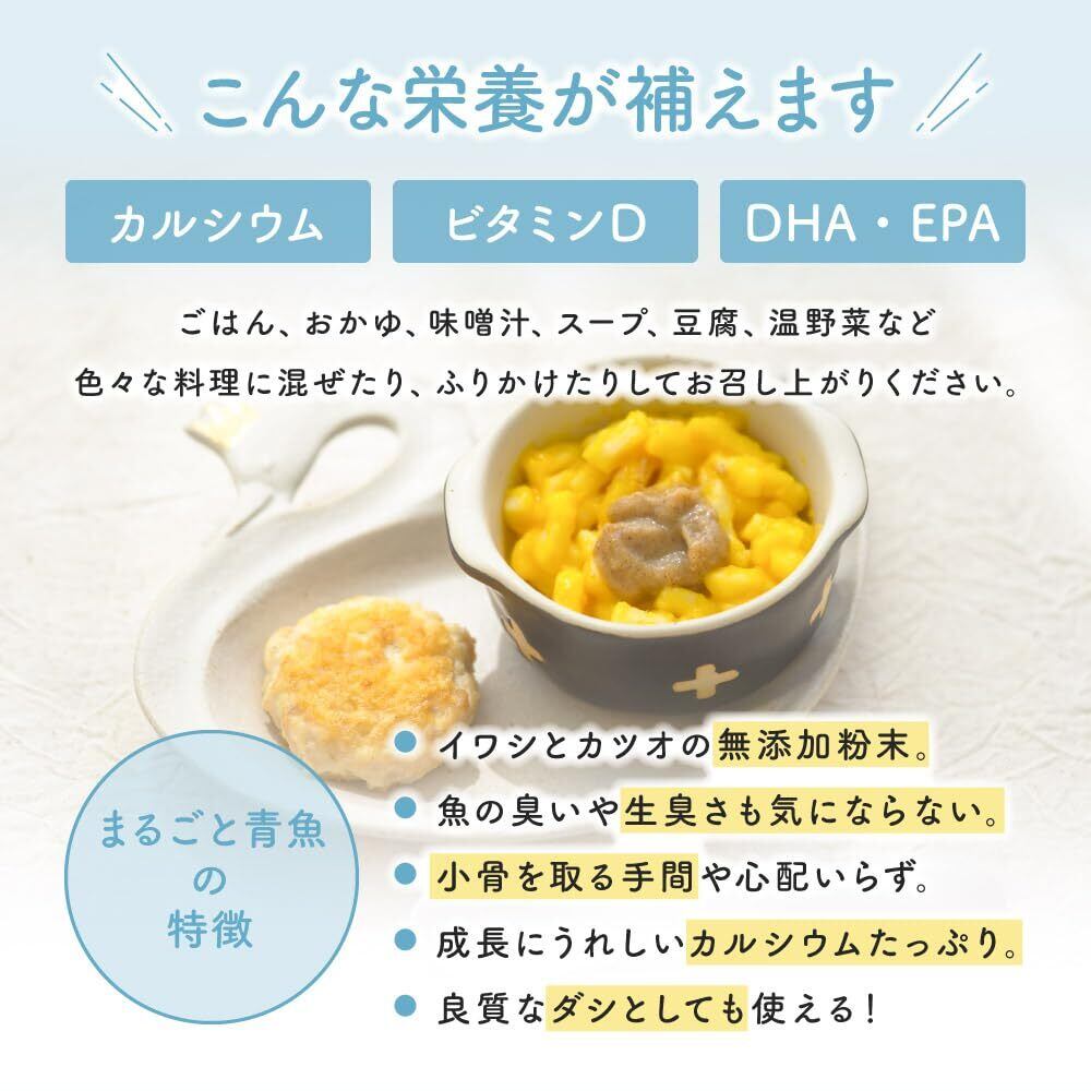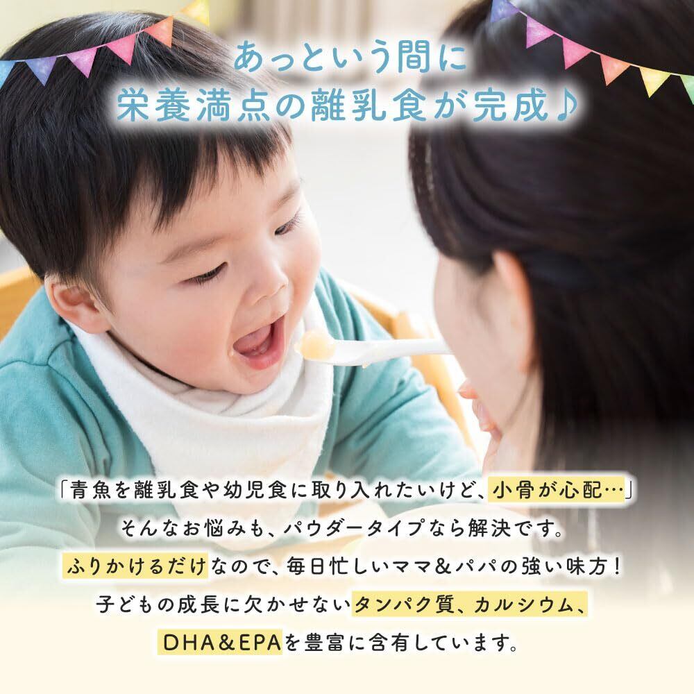 【あっという間に栄養満点の離乳食が完成】 「青魚を離乳食や幼児食に取り入れたいけど、小骨が心配…」そんなお悩みも、パウダータイプなら解決です。小骨を取る手間や心配不要!ふりかけるだけなので、毎日忙しいママ&パパの強い味方!子どもの成長に欠かせないタンパク質、カルシウム、DHA&EPAを豊富に含有しています。