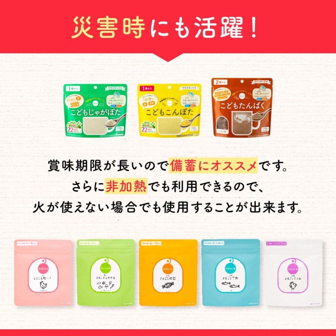 【安心・安全の品質】 bebecoシリーズは、赤ちゃんでも安心して食べられる放射性物質の基準値を満たした「乳児用規格適用食品」。また、製造ロットごとに専門機関で菌検査を実施し、合格したものを出荷しています。さらに、より安心してご利用いただけるよう、衛生管理を徹底した国内の工場で製造しています。