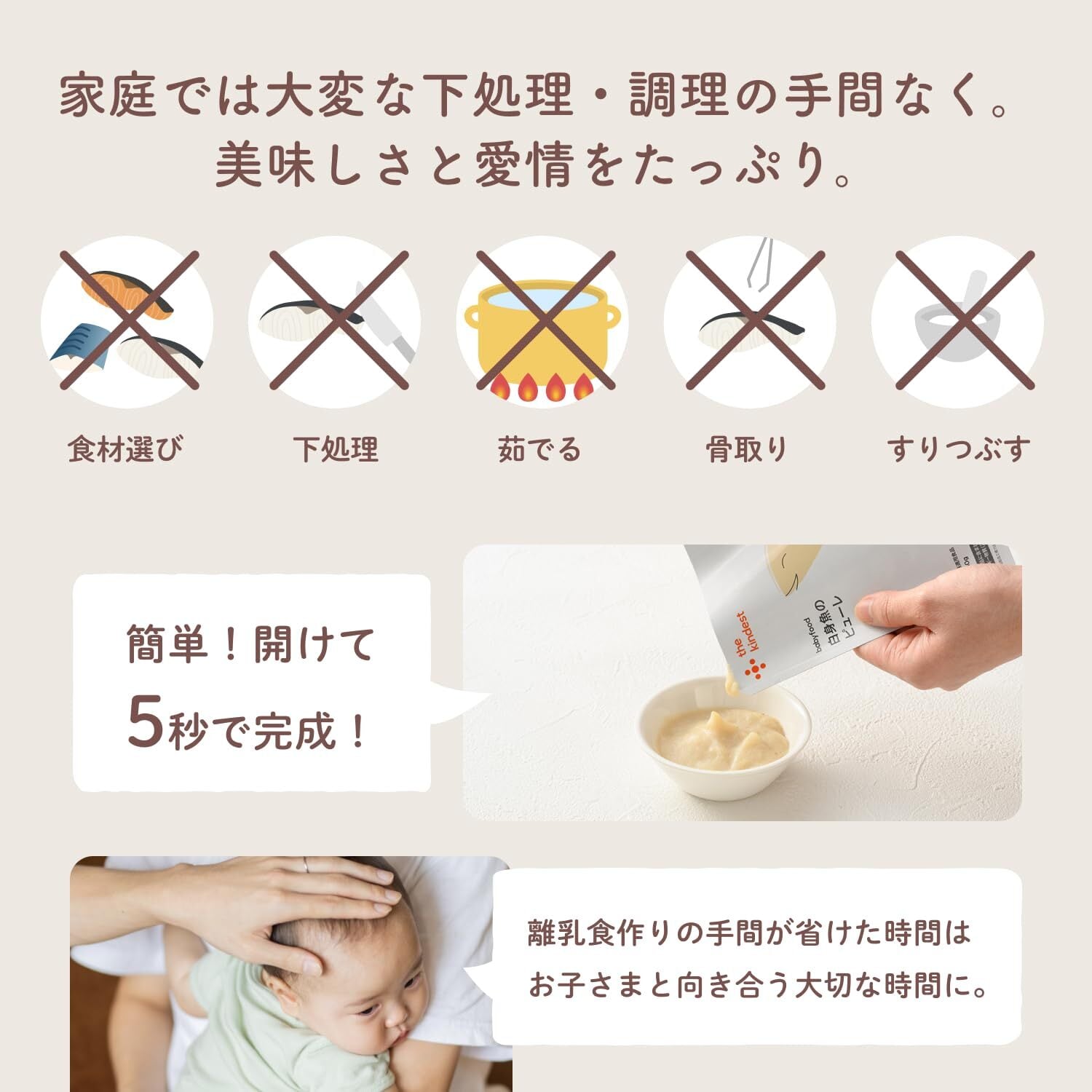 [ シェフの黄金比レシピで、素材本来の味わいを実感]「子どもが初めて出会うお 魚 の味は、 自然 で 安心 できるものであって欲しい…」そんな想いに寄り添って、家庭で手作りした 離乳食 の安心感を目指しました。原材料は【魚・じゃがいも・米粉でん粉※】のみ。余計なものは使わず、お 魚 らしさをしっかり感じられる、シンプルながらシェフの熟練の技が光る味わいです。厳しい安全基準をクリアした乳児用規格適用食品のため、安心してお召し上がり頂けます。※食品添加物ではなく、安定した滑らかさ実現のために米由来のでん粉を使用しています。