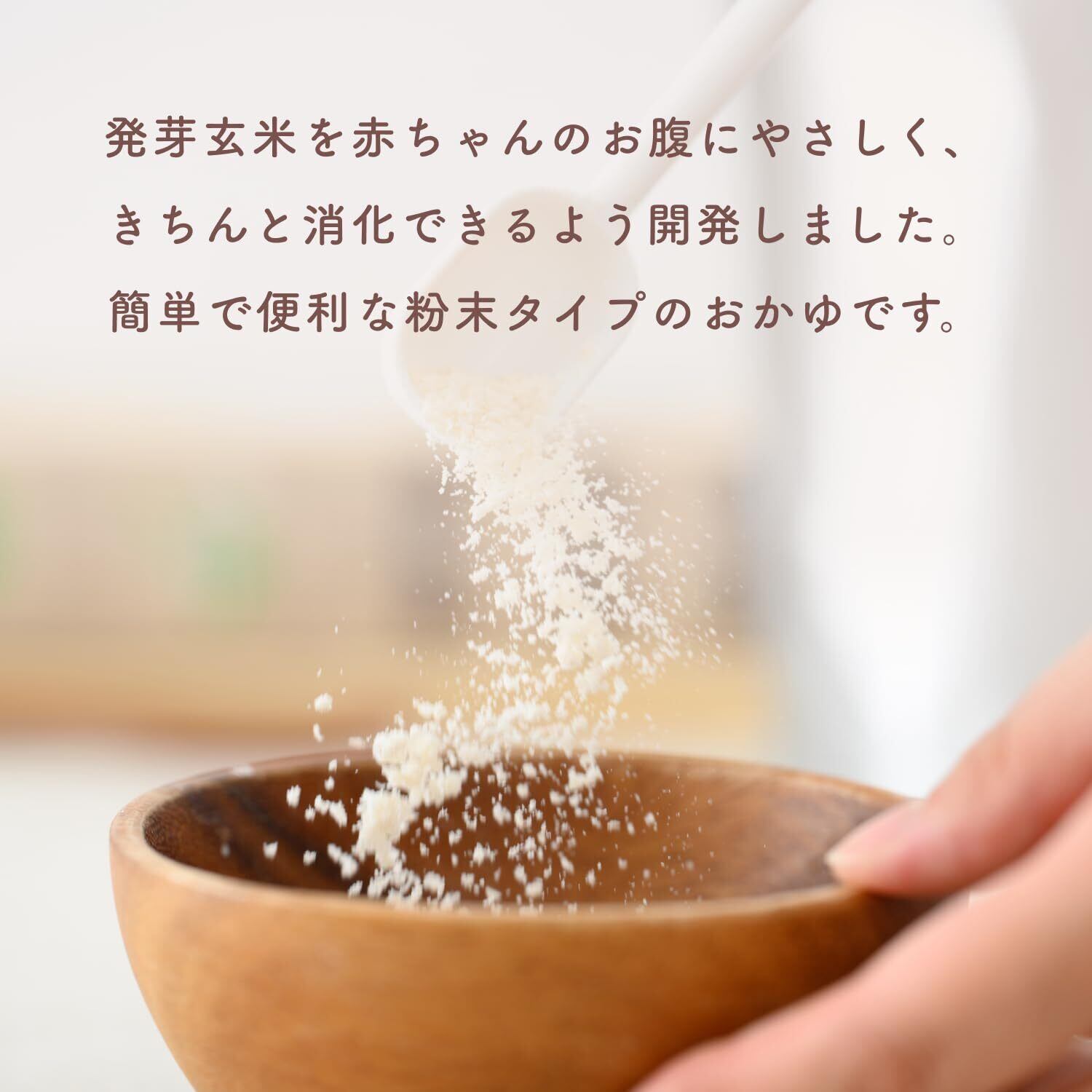 国産コシヒカリの発芽玄米を使用した、混ぜるだけで簡単に作れる、粉末タイプのおかゆです。赤ちゃんのお腹にもやさしく、きちんと消化できるように開発しました。お湯や水、ミルク、お野菜ピューレなどに混ぜてお召し上がりください。